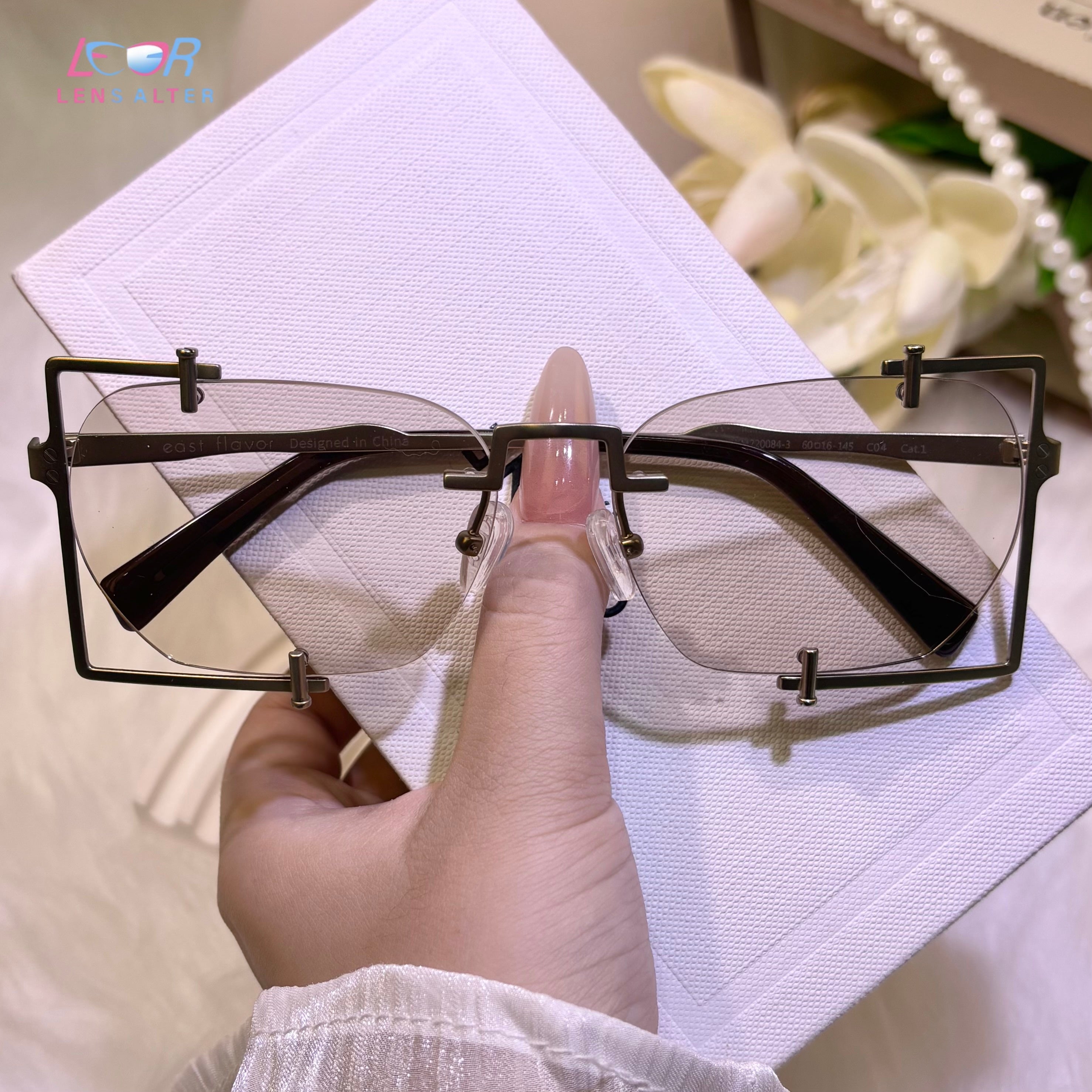 Crafted from lightweight metal with clean architectural lines, these geometric eyeglasses for women blend structural elegance with sun-ready functionality. The sharp angles and minimalist frame create a striking yet versatile silhouette.