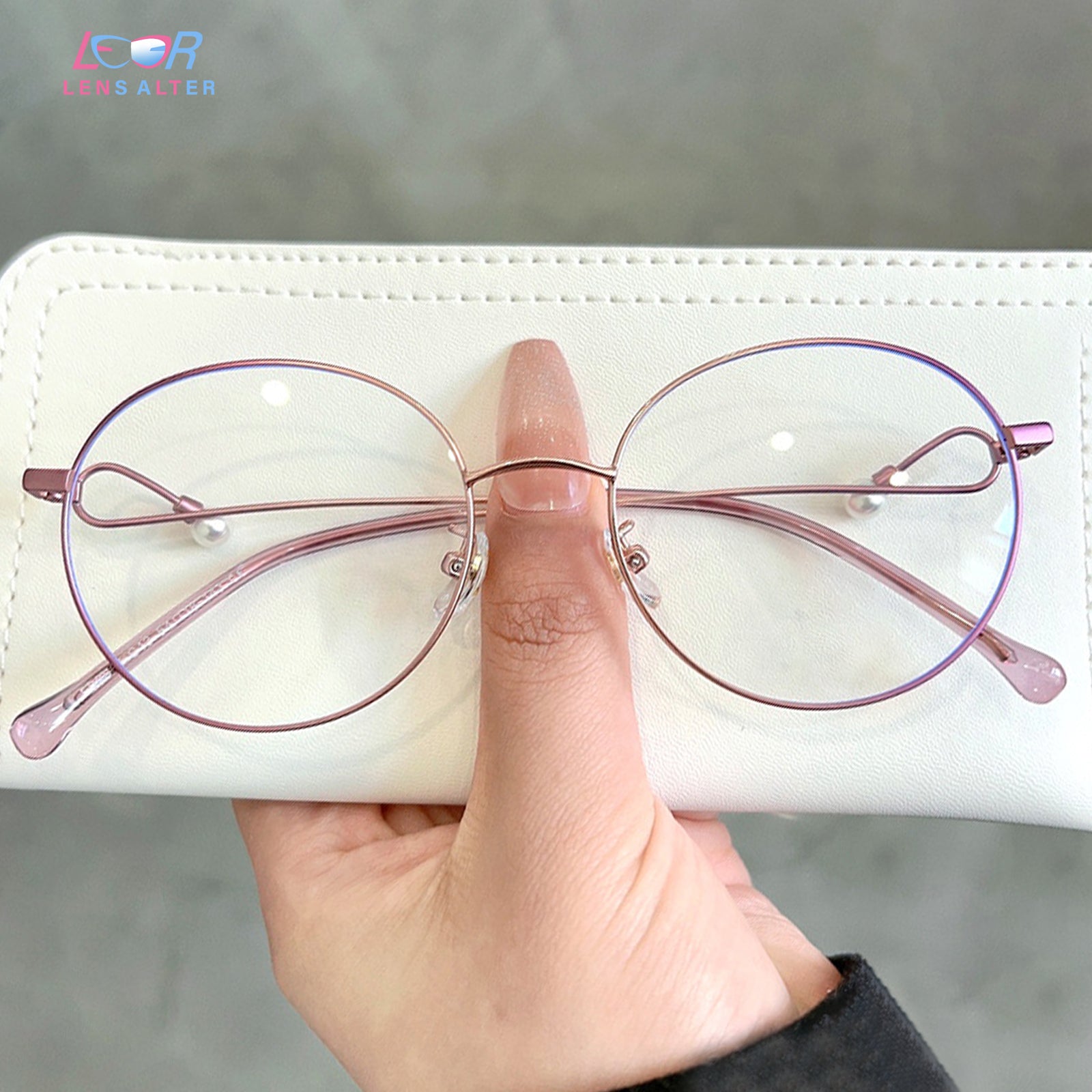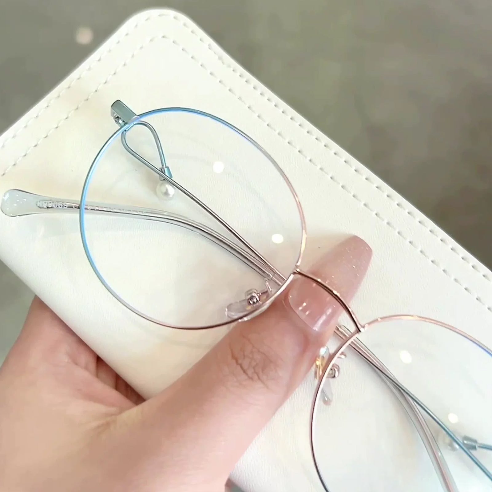 Elevate your look with our two-tone round metal-frame glasses, where modern design meets timeless elegance. The striking color contrast adds a bold touch, while the delicate pearl accents on the temples bring an air of effortless sophistication. Perfect for the fashion-forward, these frames exude a sense of graceful charm with a chic, contemporary edge.