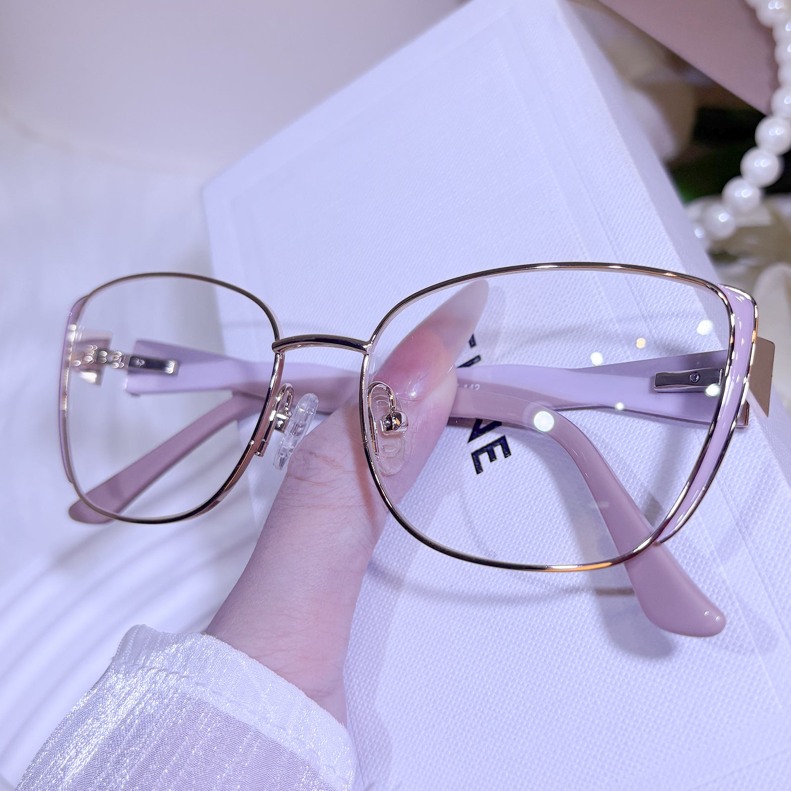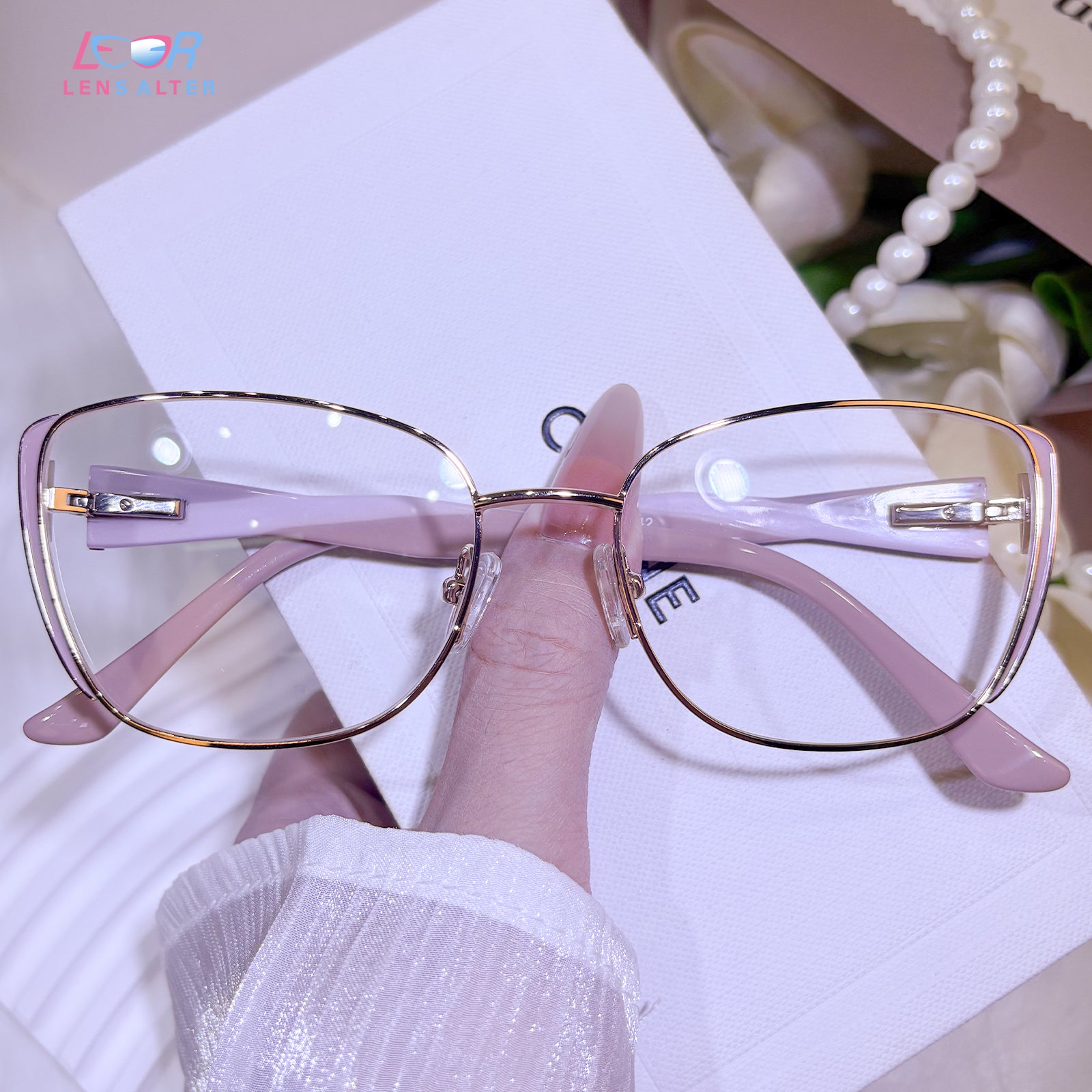 Defined by its gentle uplift and soft pink glow, these cat-eye glasses embody a quiet confidence. The meticulously crafted metal frame offers a look of delicate strength—for the woman who knows that true elegance lies in the balance of timeless charm and contemporary poise.