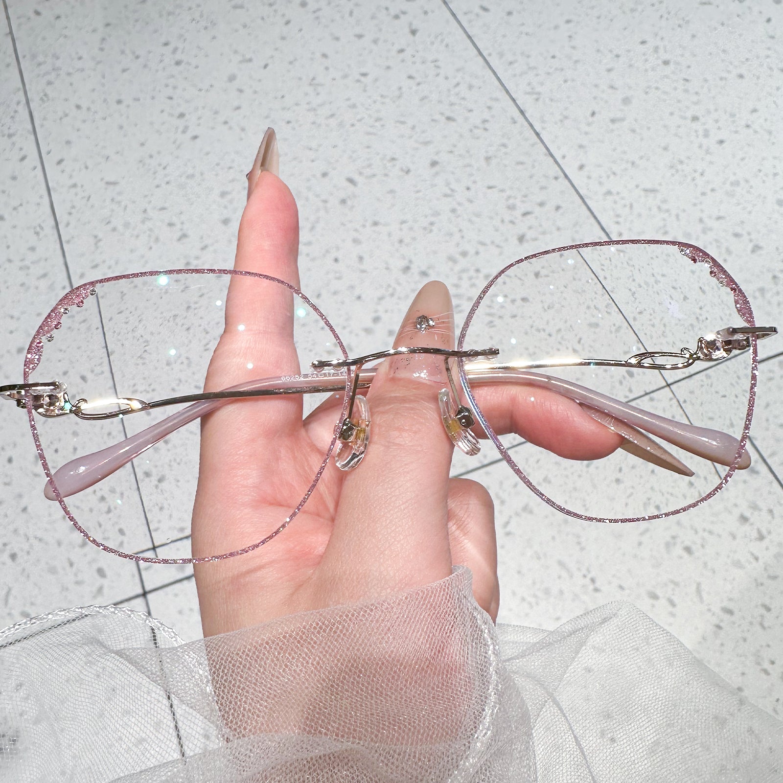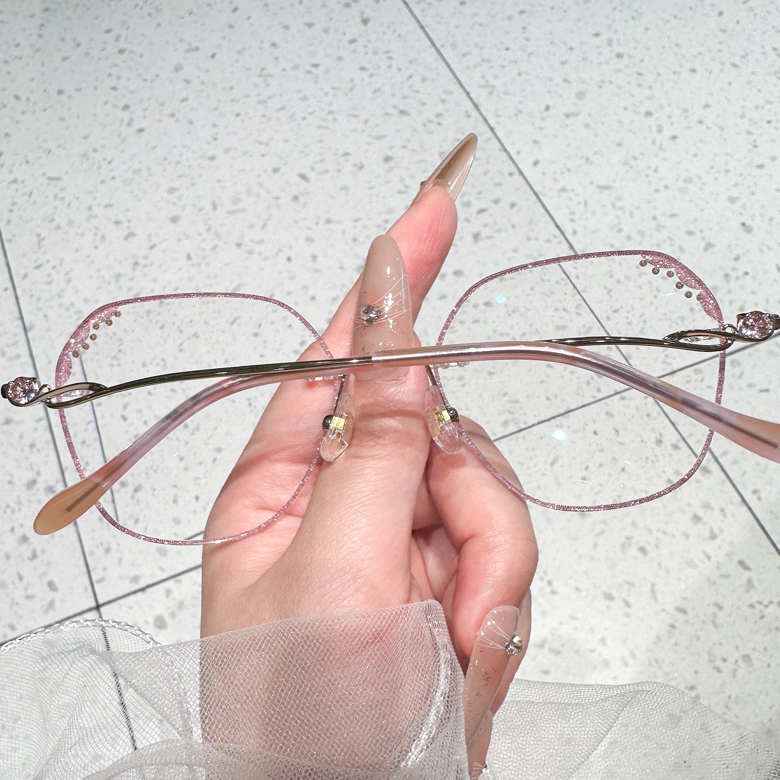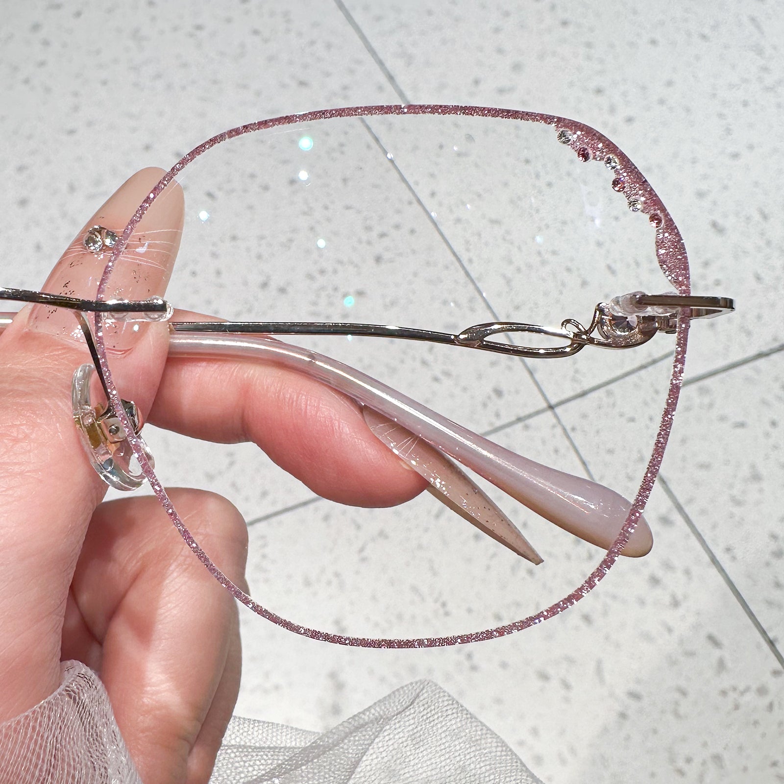 Elegant pink rimless glasses. Lenses are adorned with sparkling diamonds. The hollowed-out temples, also embellished with diamonds, add a touch of luxury and sophistication. Perfect for making a stylish and glamorous statement, these glasses are designed to shine.