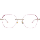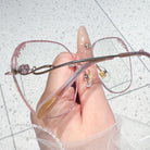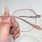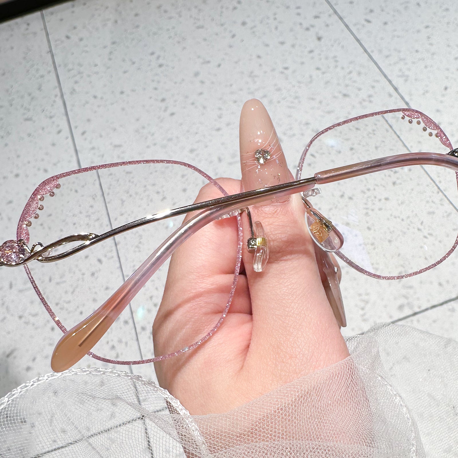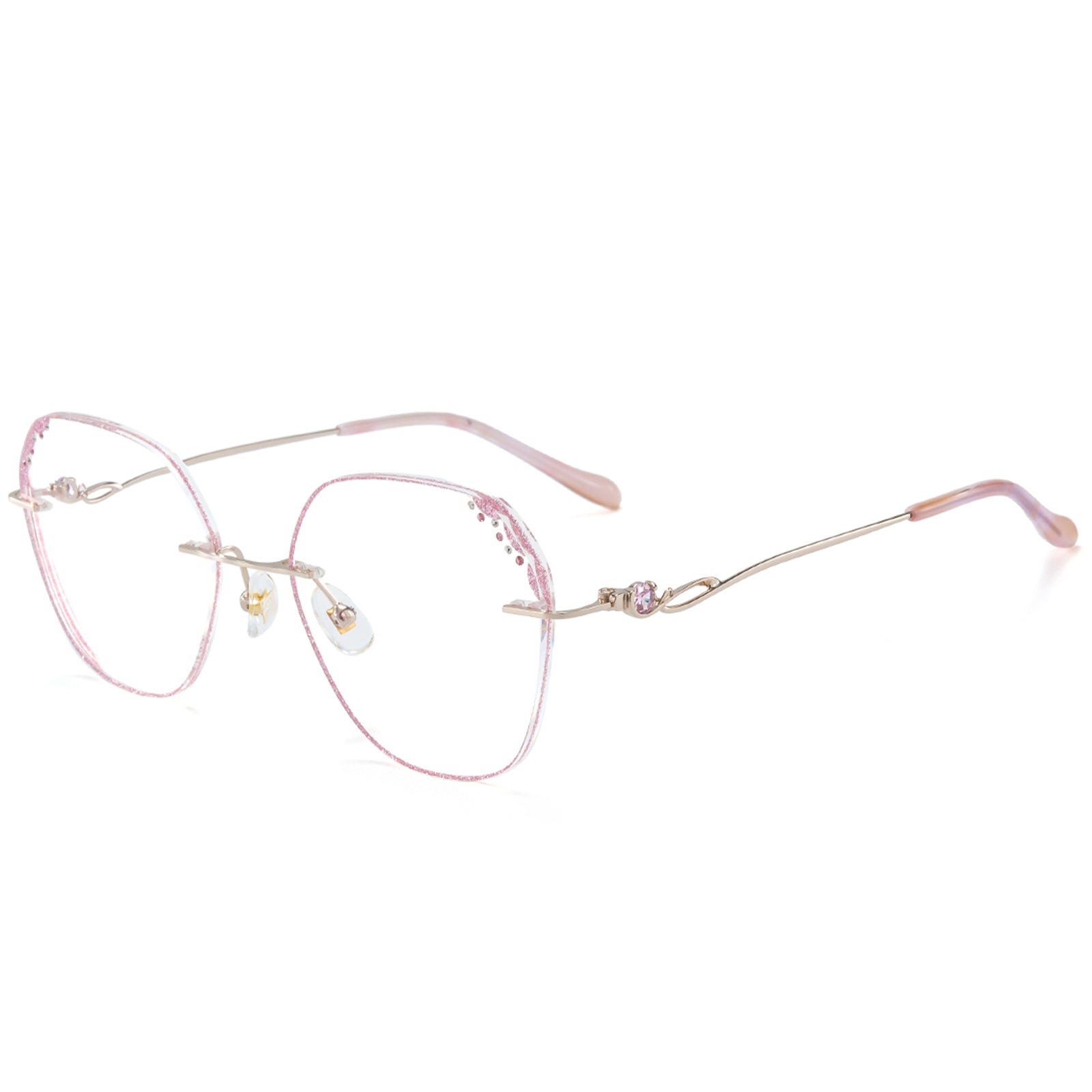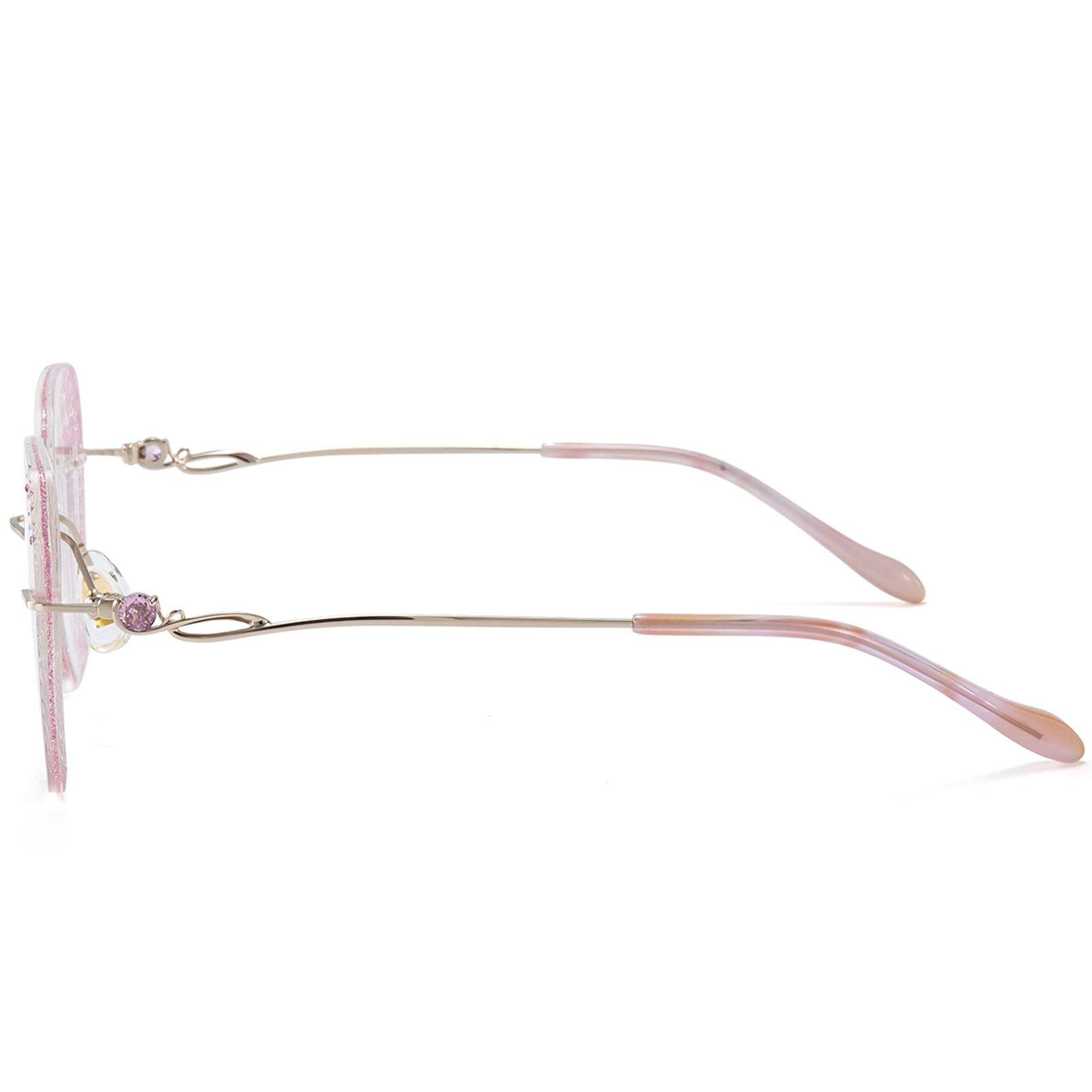 Elegant pink rimless glasses. Lenses are adorned with sparkling diamonds. The hollowed-out temples, also embellished with diamonds, add a touch of luxury and sophistication. Perfect for making a stylish and glamorous statement, these glasses are designed to shine.