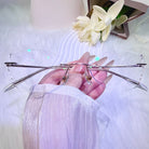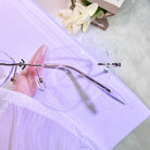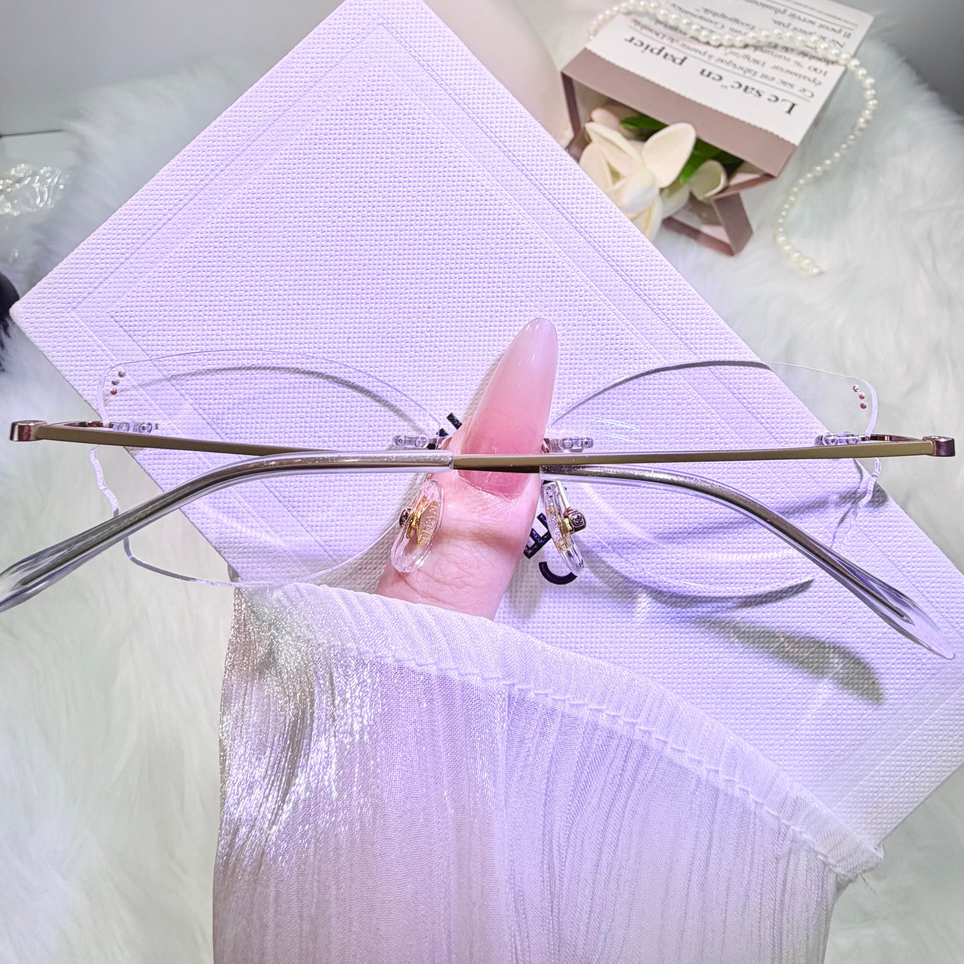 These enchanting rimless glasses feature lens shapes inspired by butterfly wings, complete with transparent lenses adorned with sparkling crystals. Crafted from titanium, they’re lightweight, graceful, and beautifully magical.