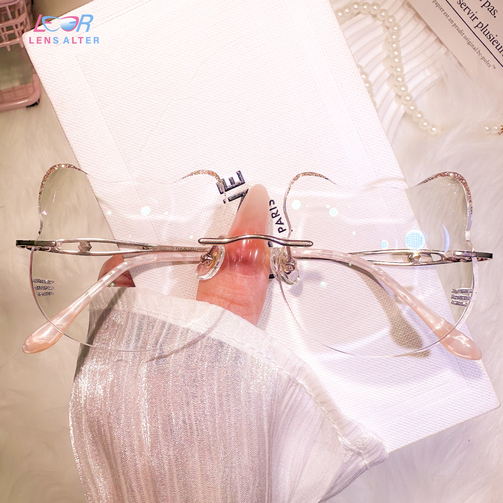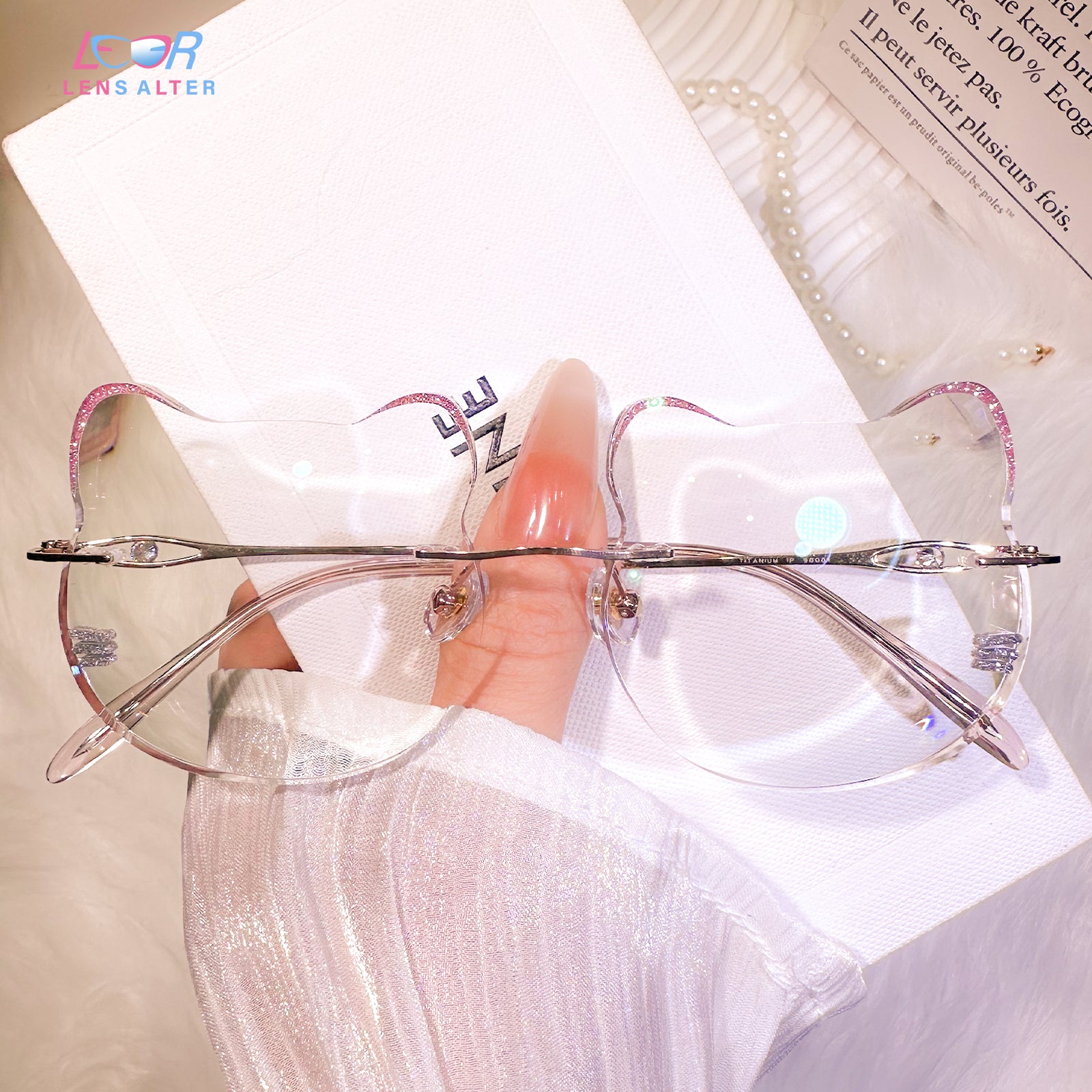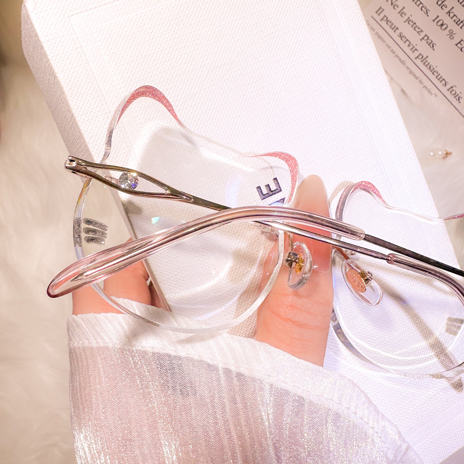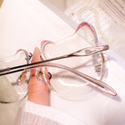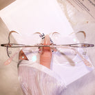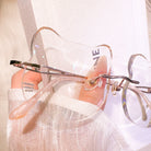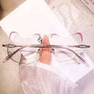 | Exclusive Design | Super cute whisker-inspired rimless glasses designed in an adorable cat silhouette. The lenses feature gentle playful curves, while the temple tips are accented with small blue beads for a charming touch. Made with lightweight titanium temples, they are incredibly comfortable for all-day wear — perfect for anyone who loves a soft, sweet, and unique aesthetic.