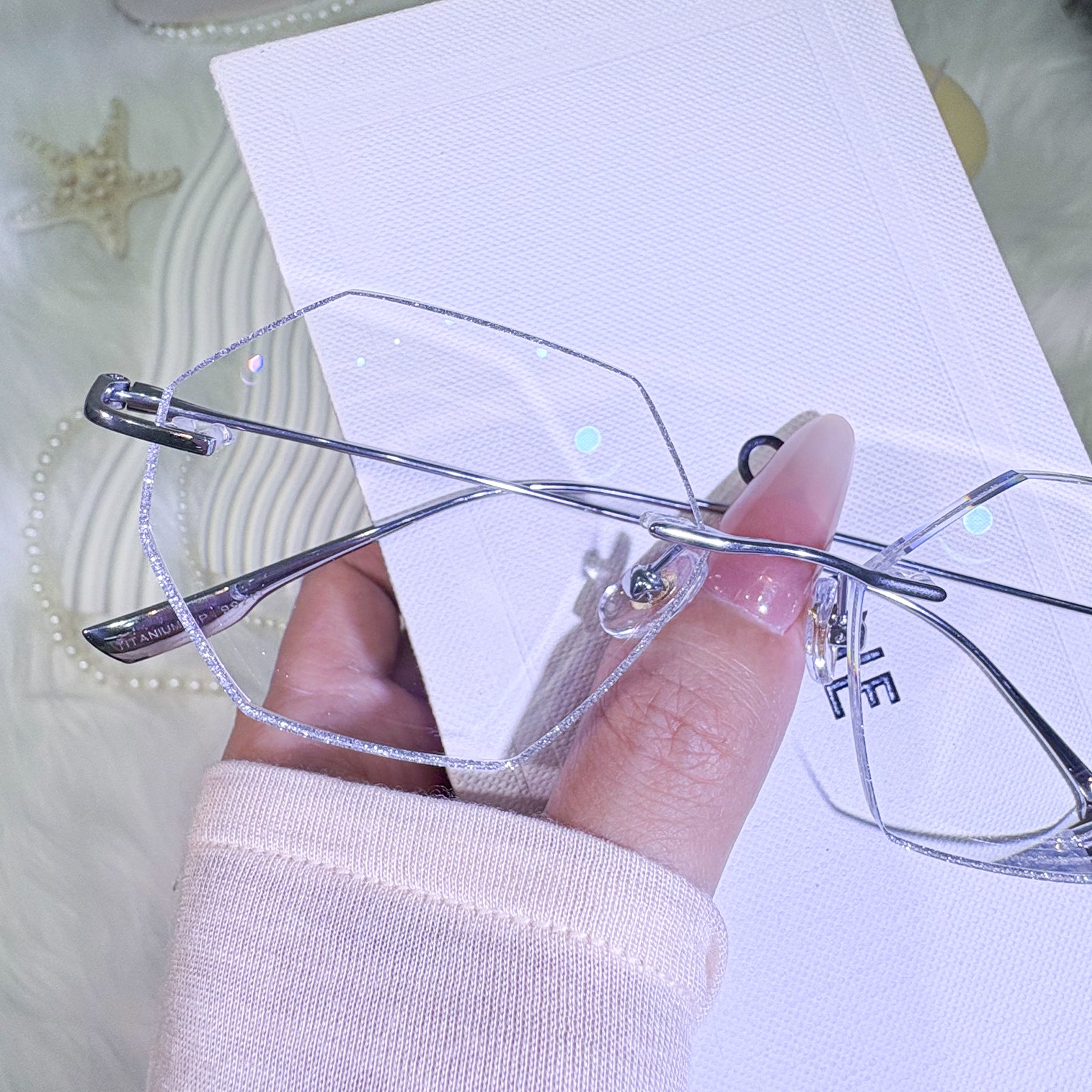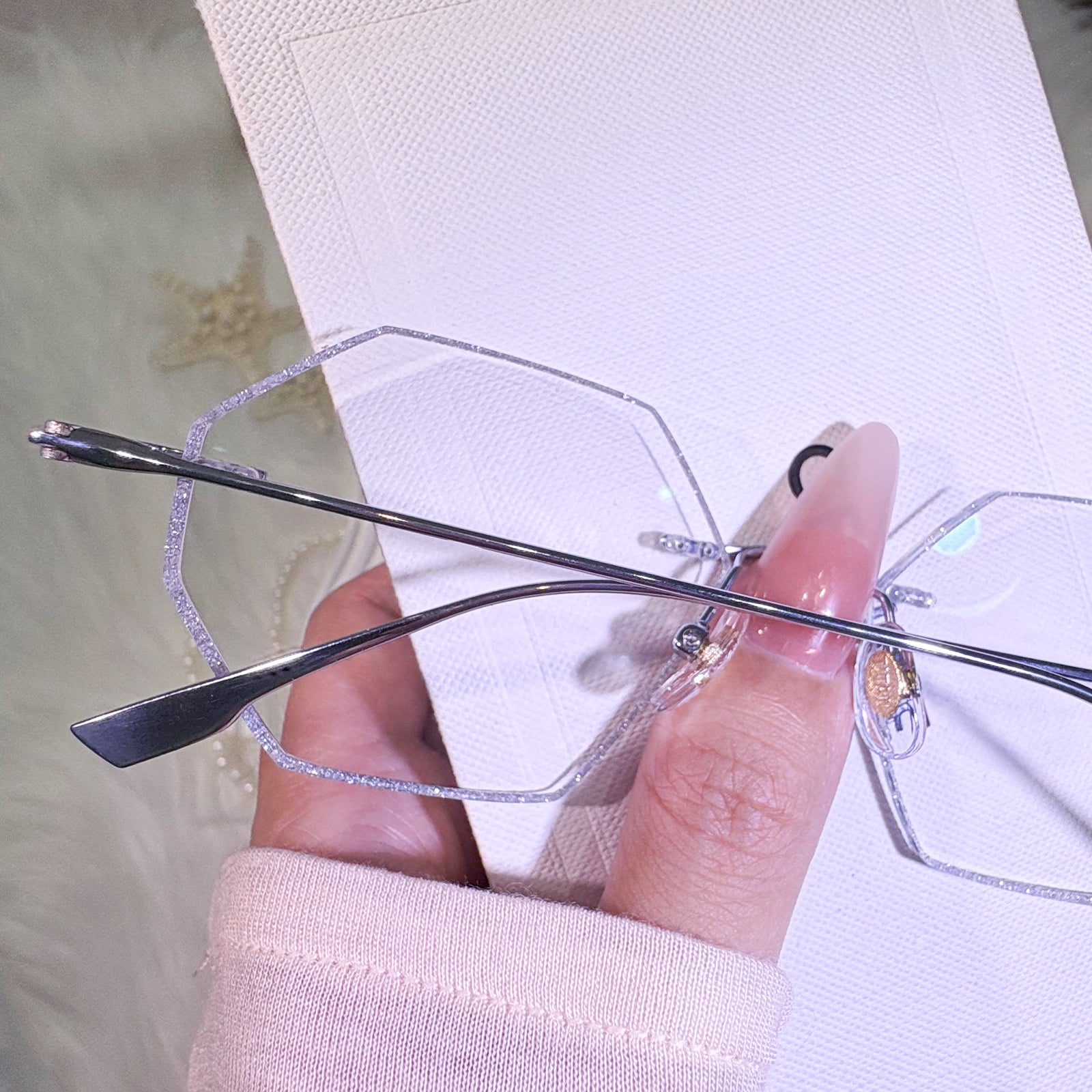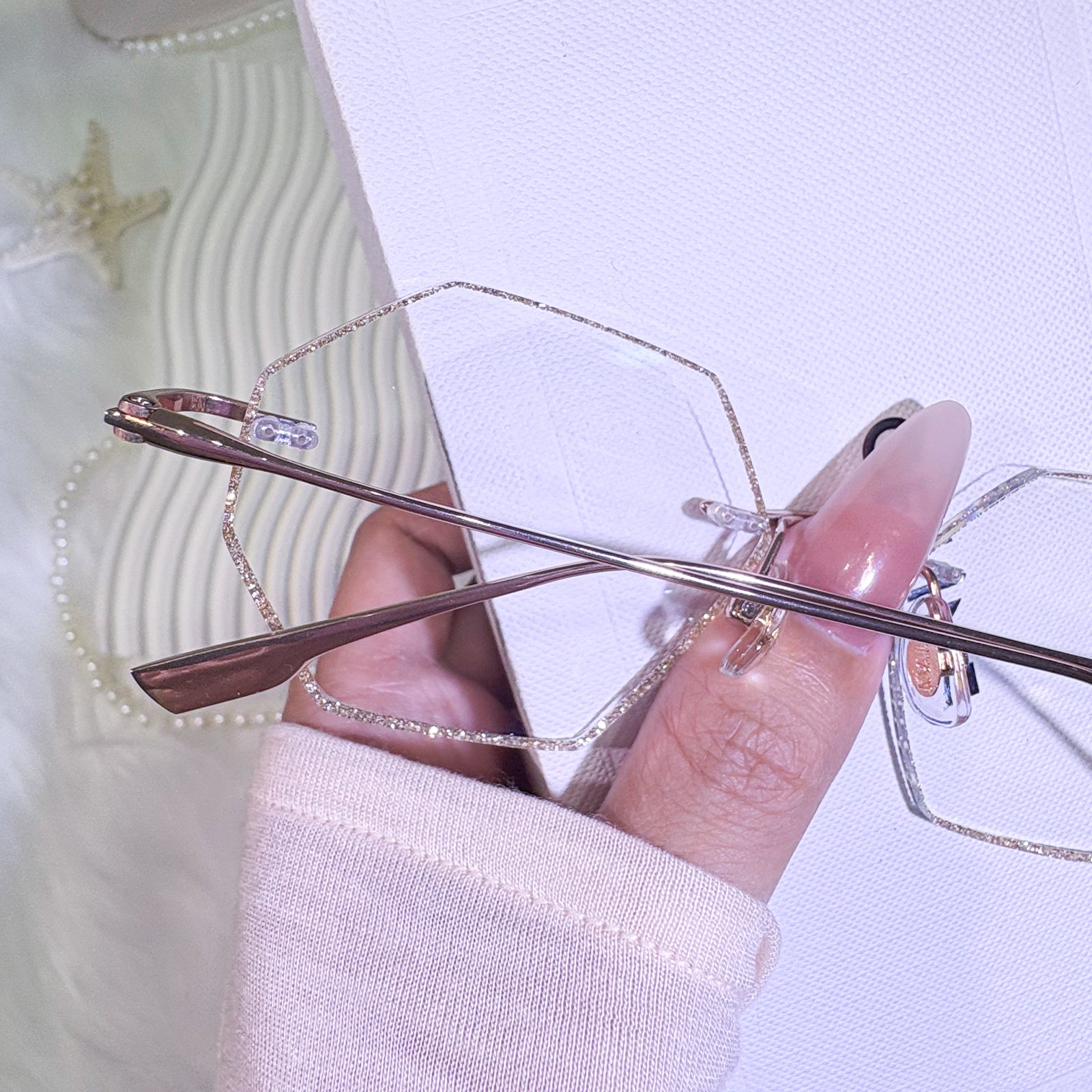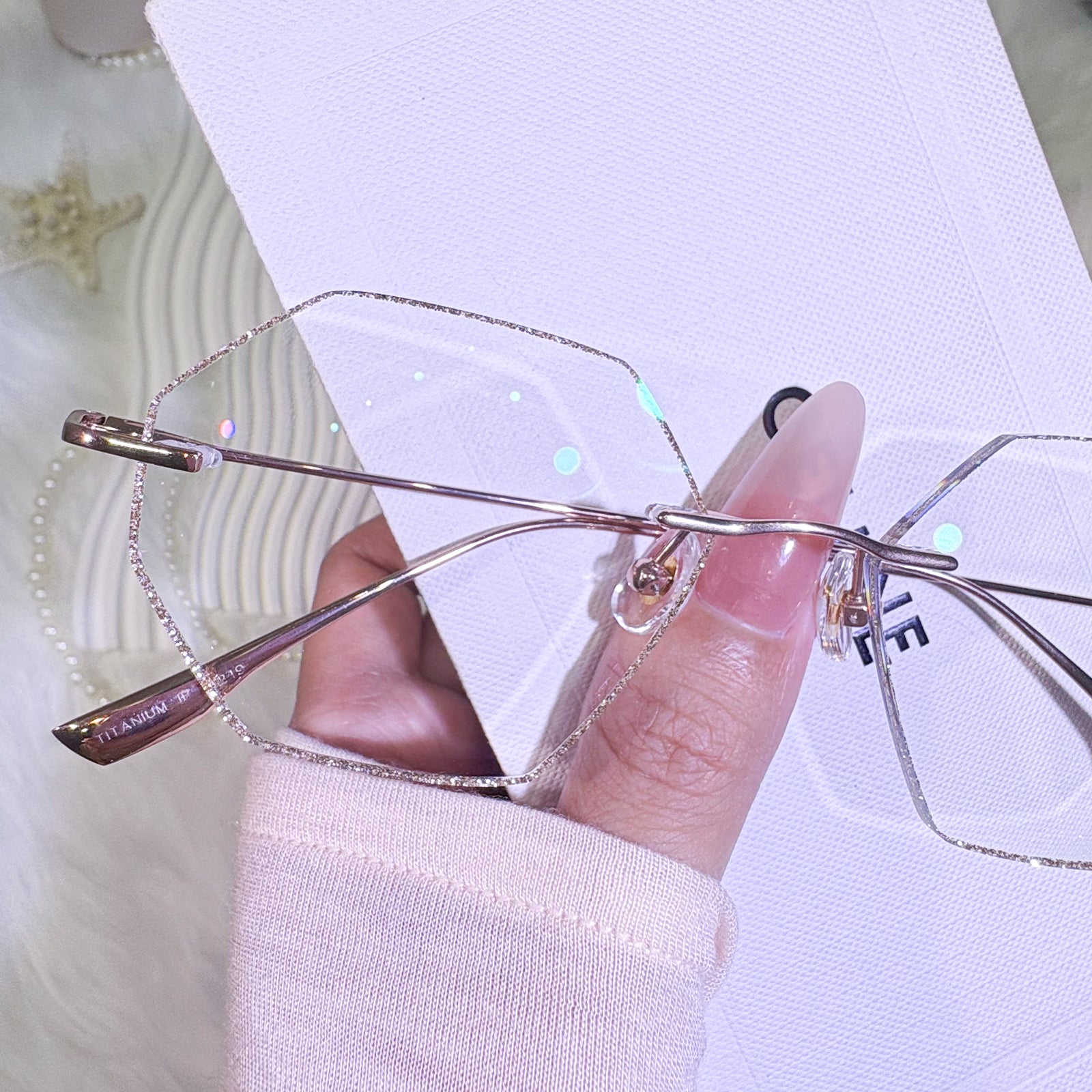 | Exlusive Design | This pair of polygonal rimless glittery glasses combines modern minimalism with timeless elegance. The unique geometric lenses are paired with ultra-thin, classic titanium temples that offer exceptional lightness and comfort. Sophisticated yet subtle, they’re perfect for everyday wear while making a chic and contemporary statement.