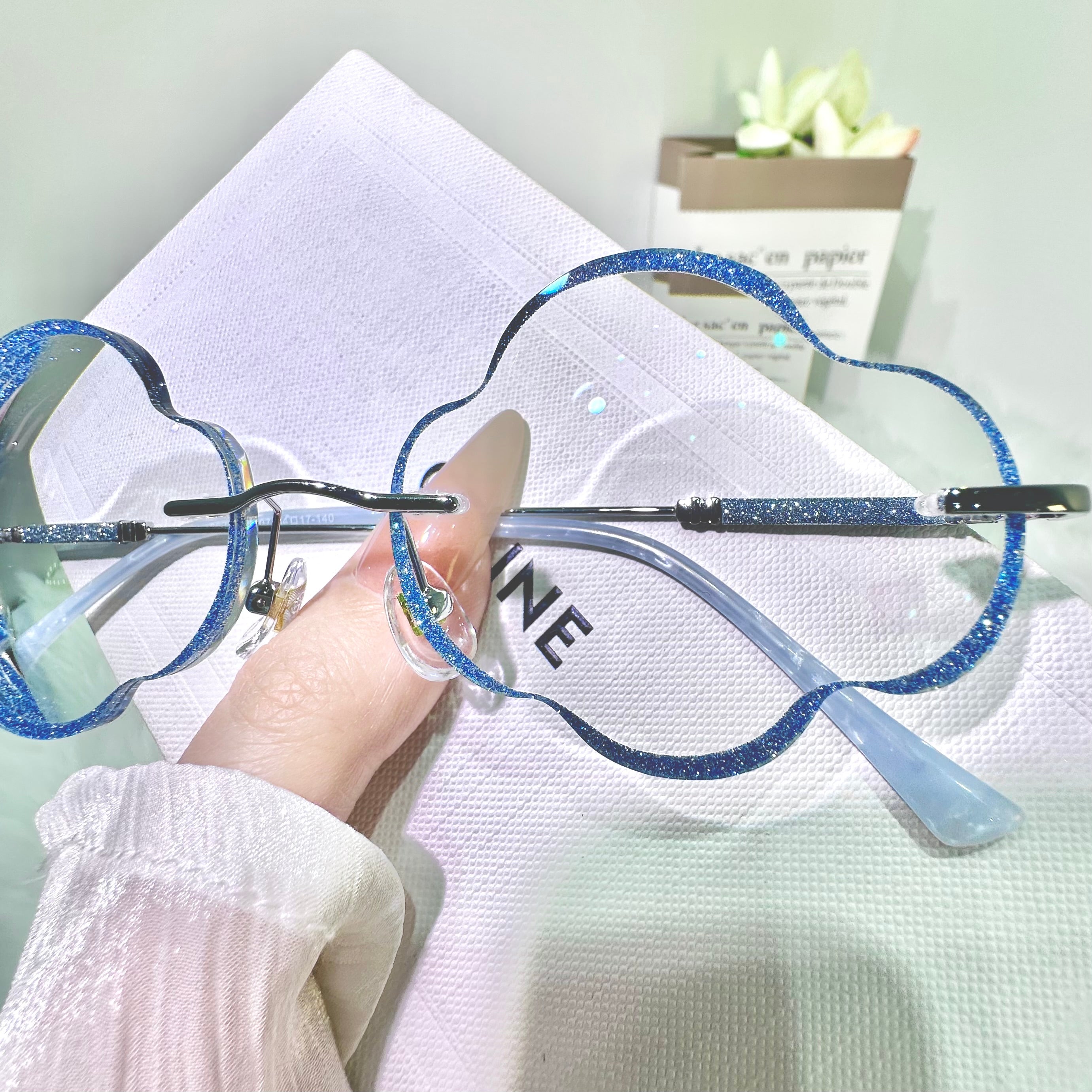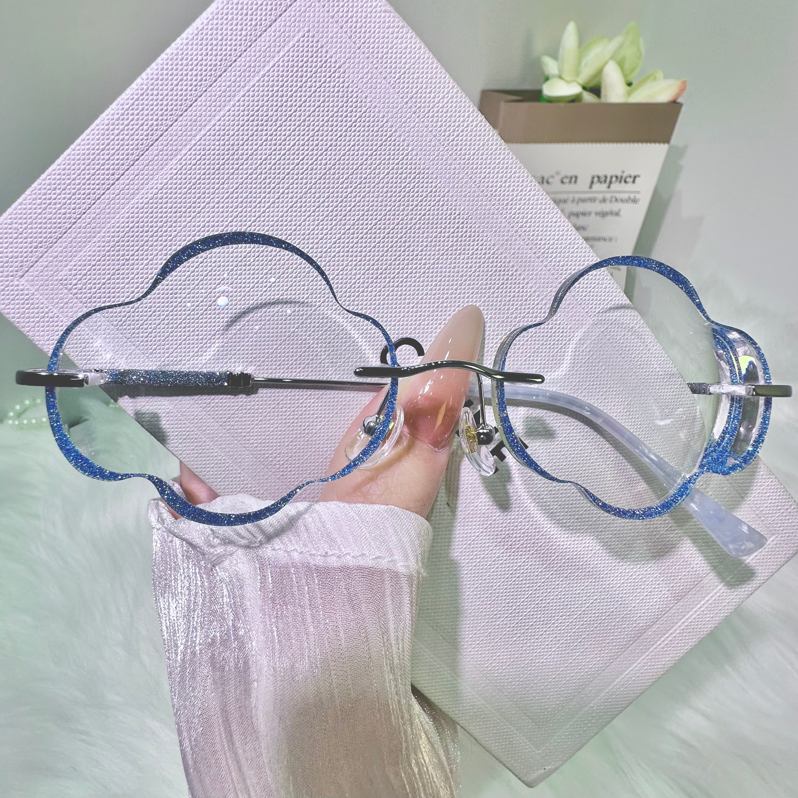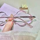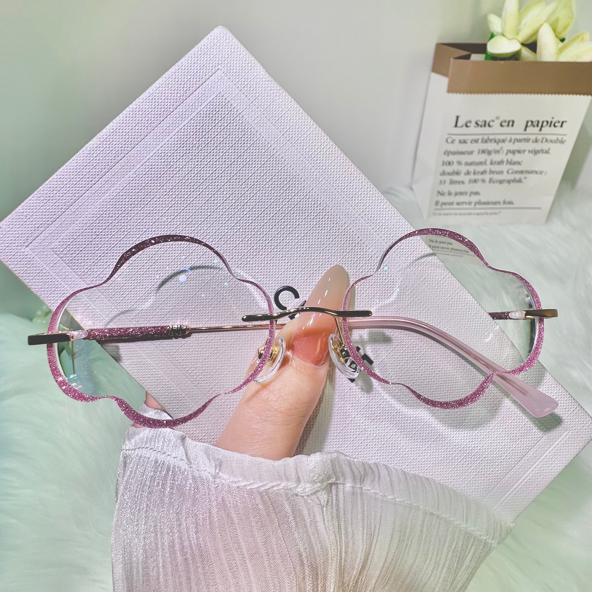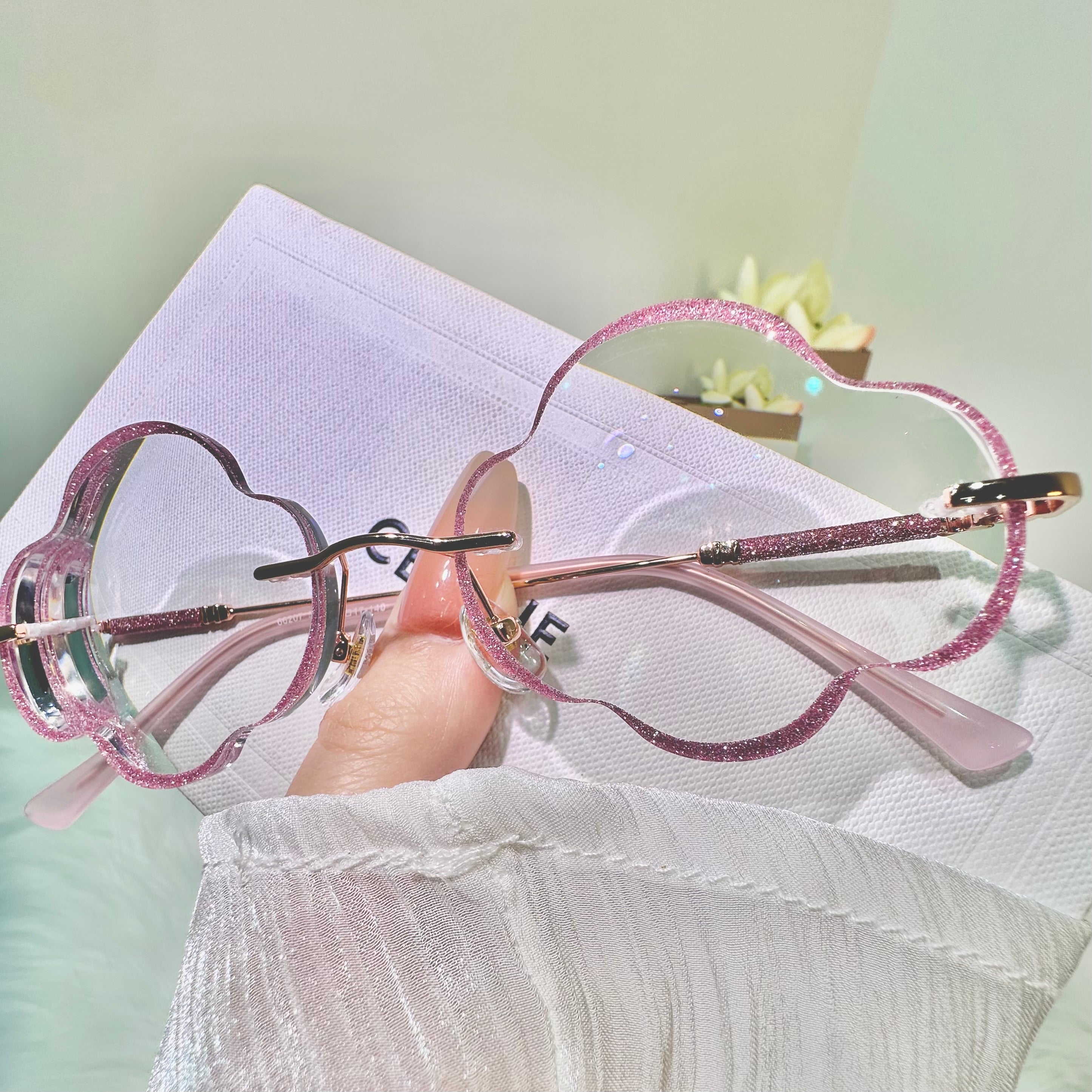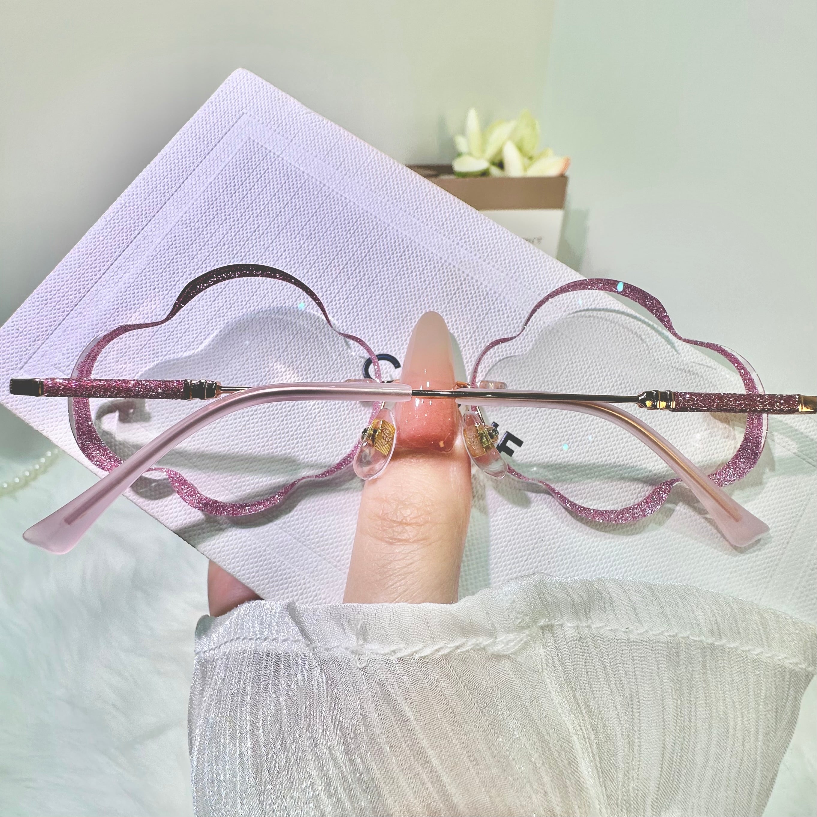 |Exclusive Design|Cloud-Shaped Rimless Glasses – dreamy, dazzling, and full of whimsy. Featuring uniquely sculpted cloud-shaped lenses sprinkled with shimmering glitter, these glasses bring a magical, fairy-tale charm to your everyday look. The delicate metal temples are adorned with sparkling details that catch the light with every movement, making this pair a perfect accessory for those who love a soft, imaginative, and standout style.