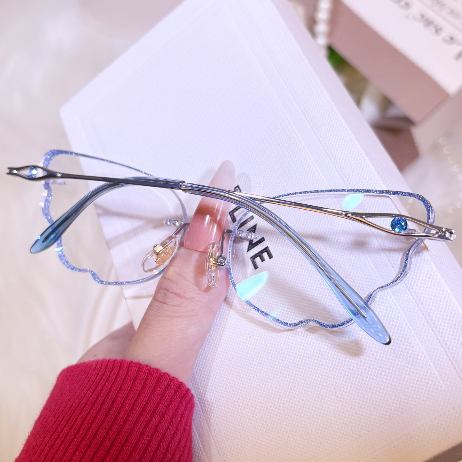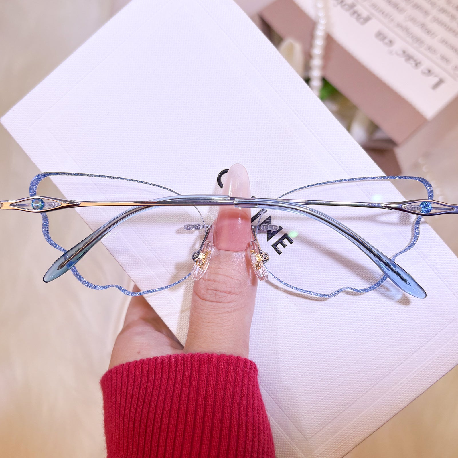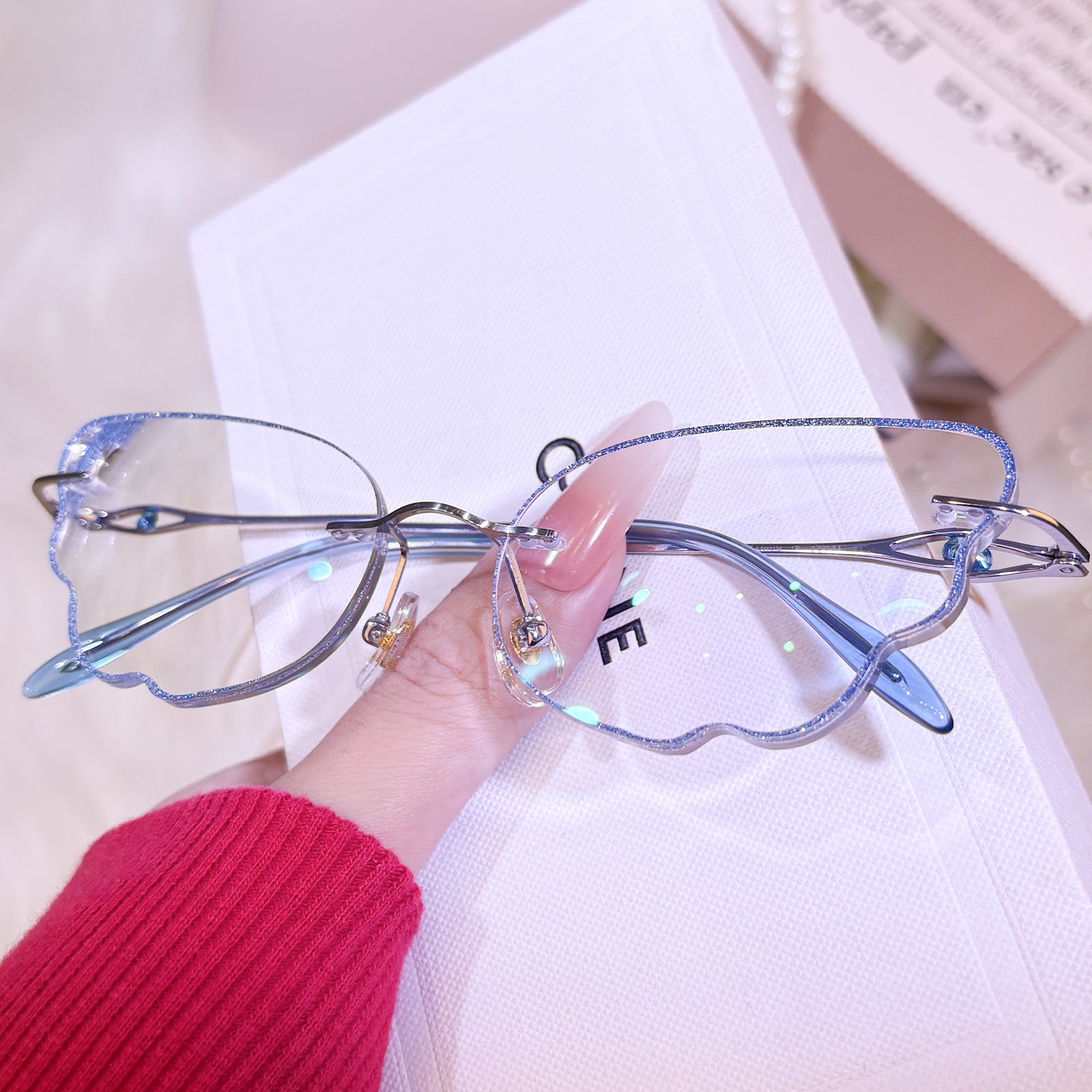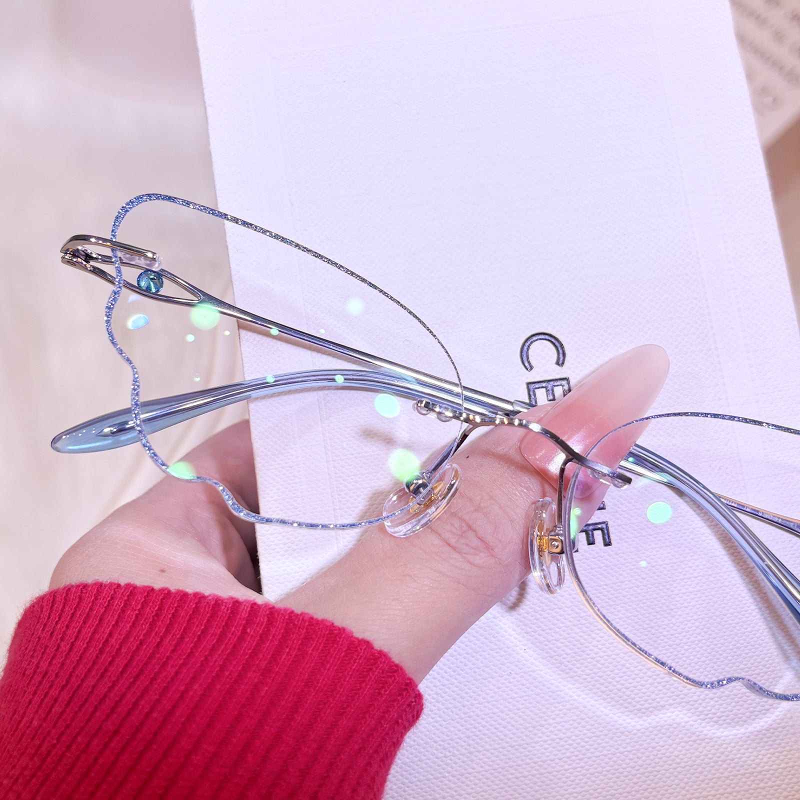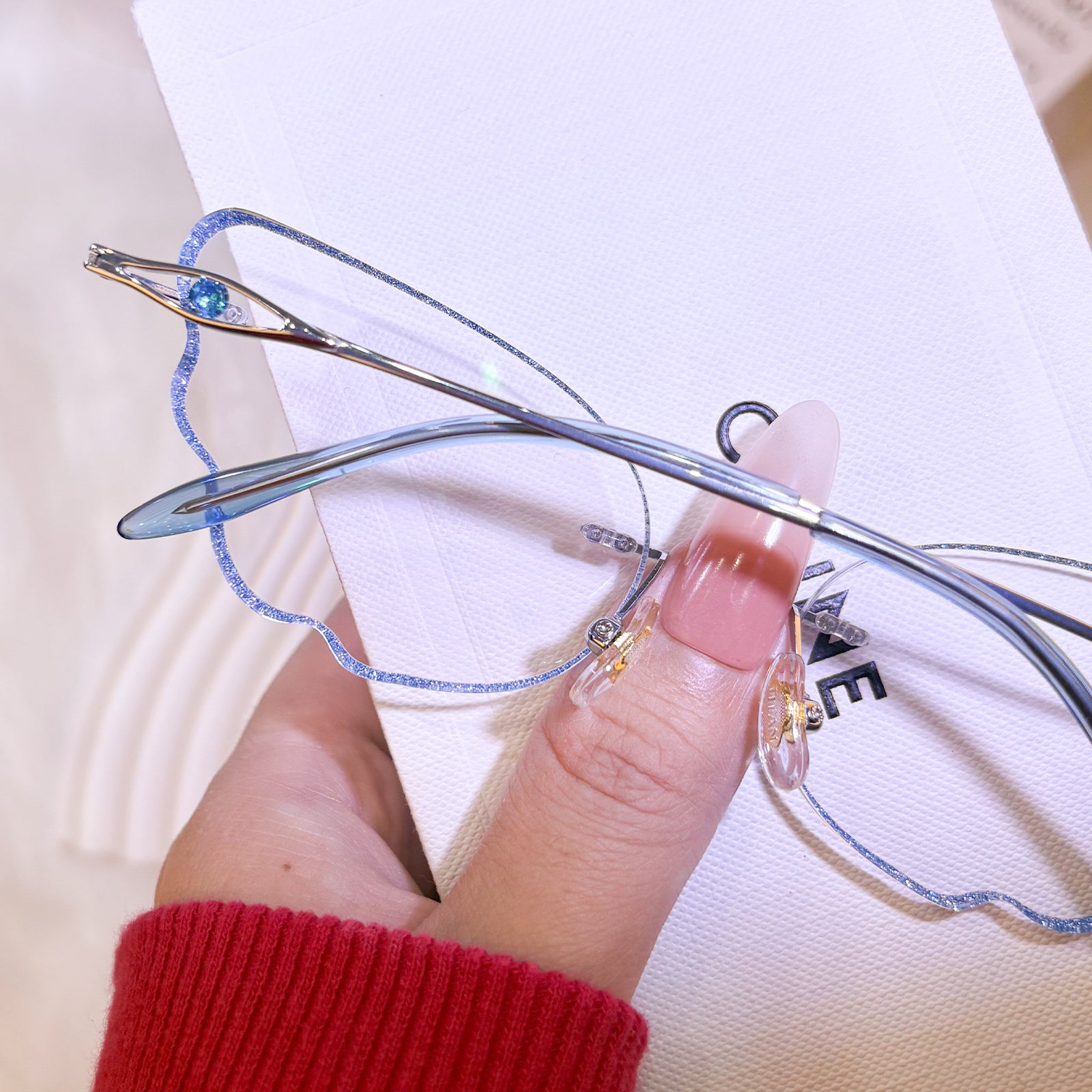 | Exclusive Design | These angel-wing–shaped rimless glasses bring a heavenly touch to your style, featuring soft blue tones and shimmering glitter along the edges of the lenses. The gemstone-adorned temples add an extra sparkle, making the whole piece feel divine, dreamy, and beautifully ethereal. Perfect for anyone who loves graceful, magical accessories.