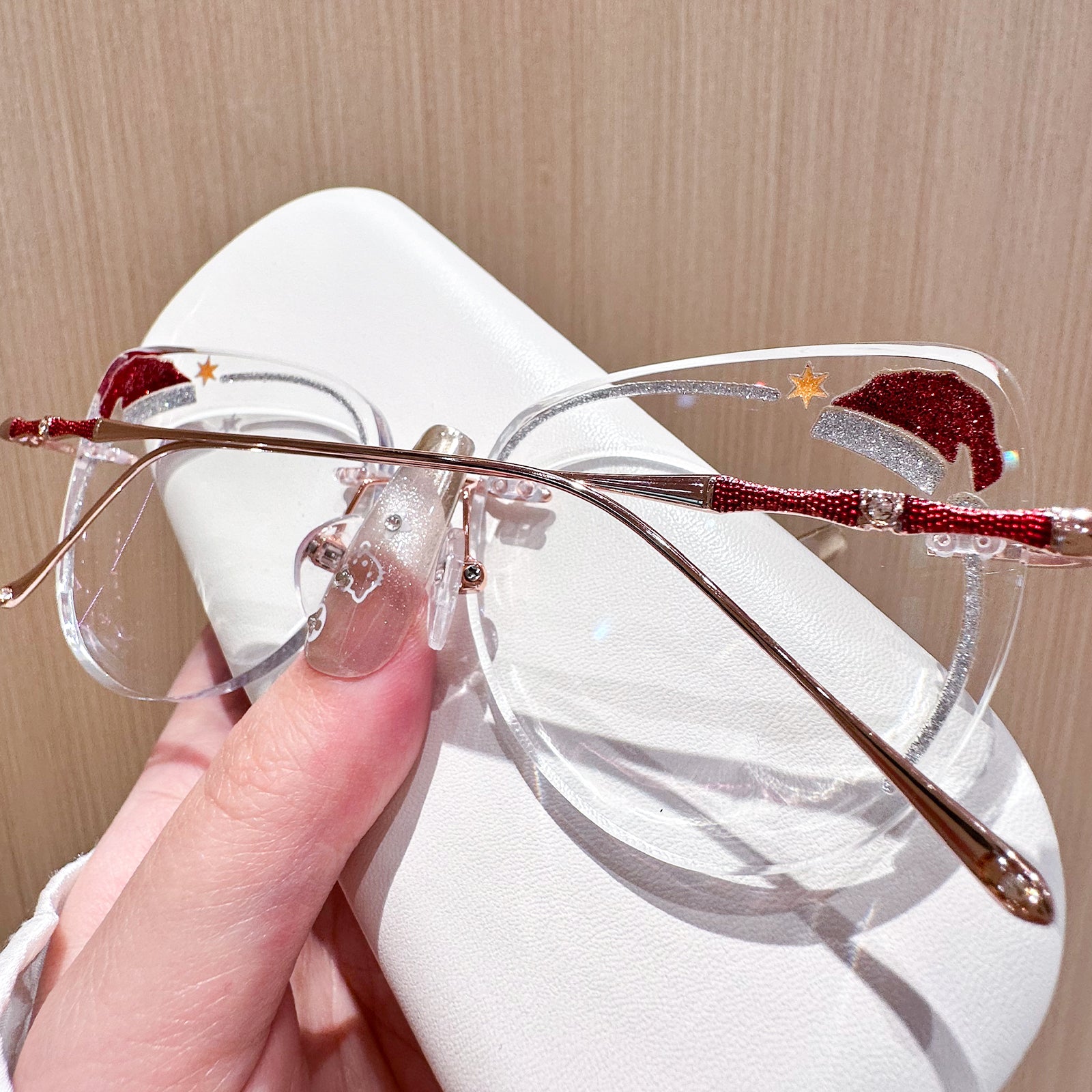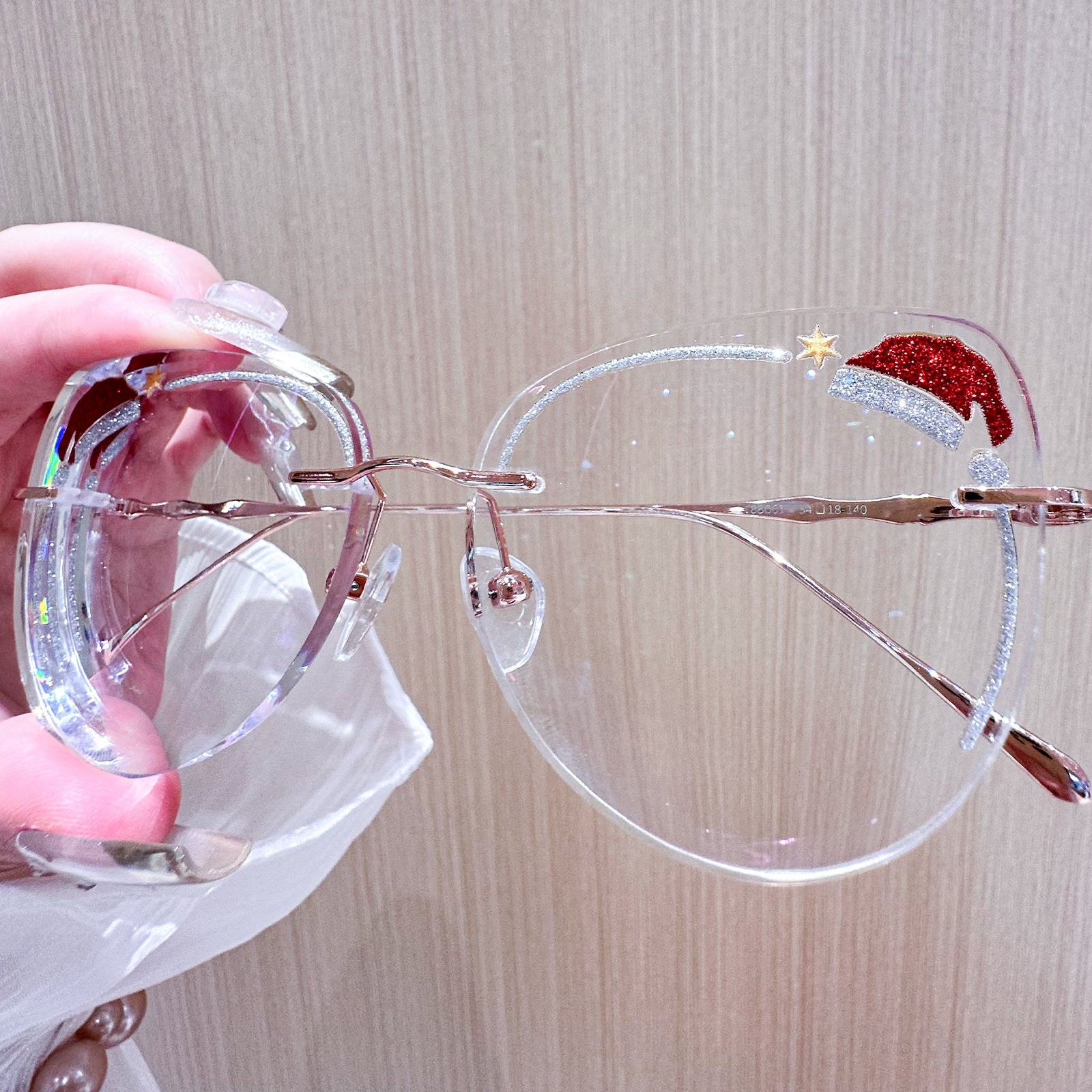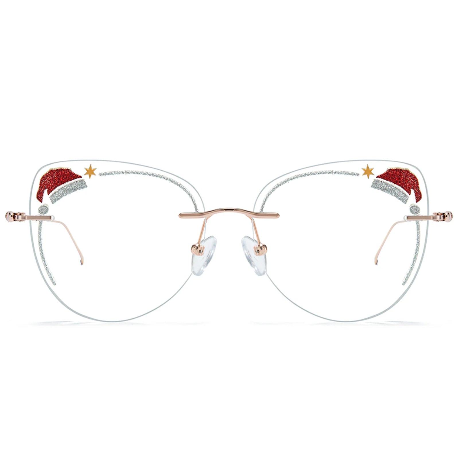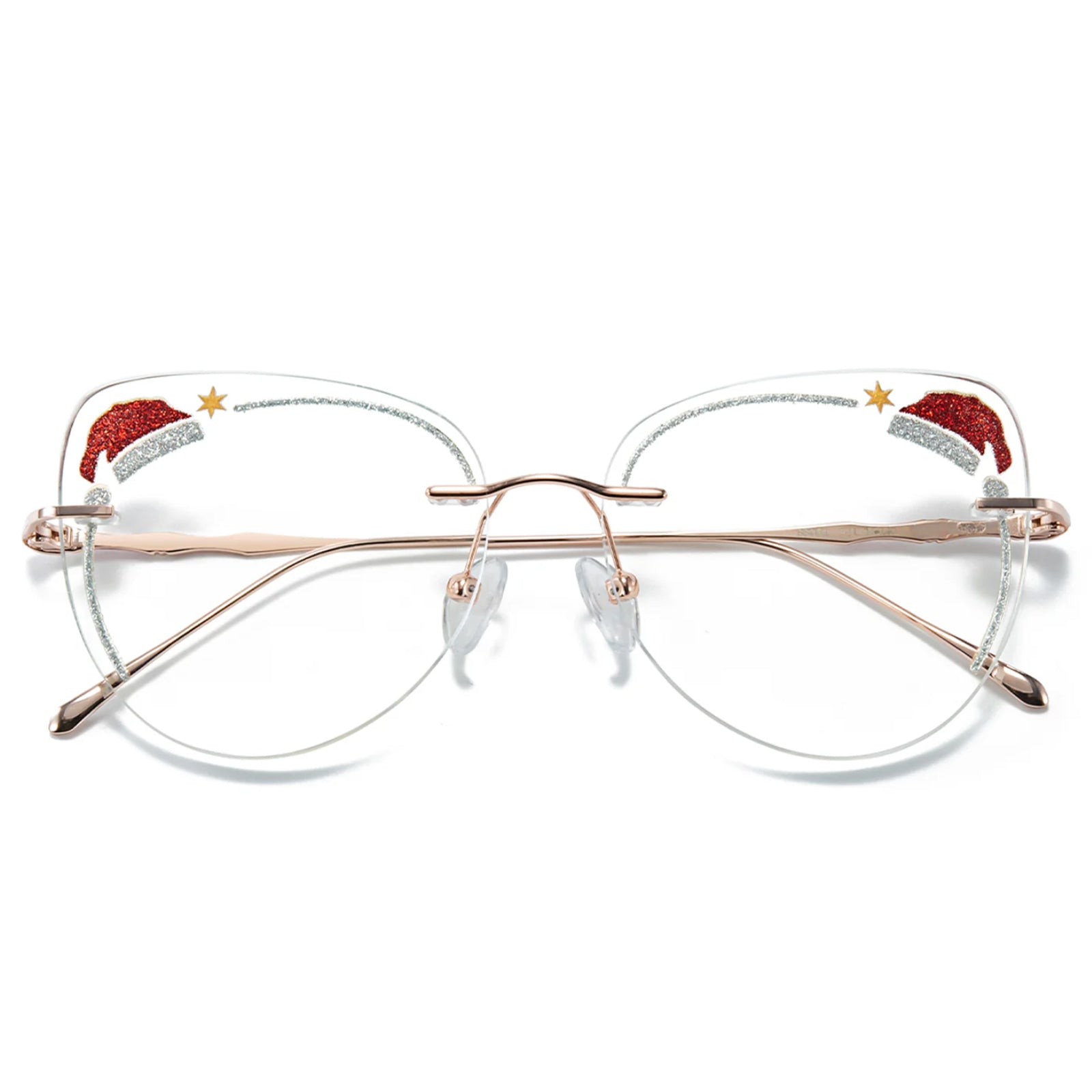 Bring the magic of the season to your style with these enchanting rimless cat-eye glasses. Featuring playful Christmas hat decorations on the lenses and festive holiday-colored temples, these frames are the ultimate winter accessory. Dreamy, whimsical, and oh-so-chic, they’re perfect for adding a touch of holiday sparkle to your look.