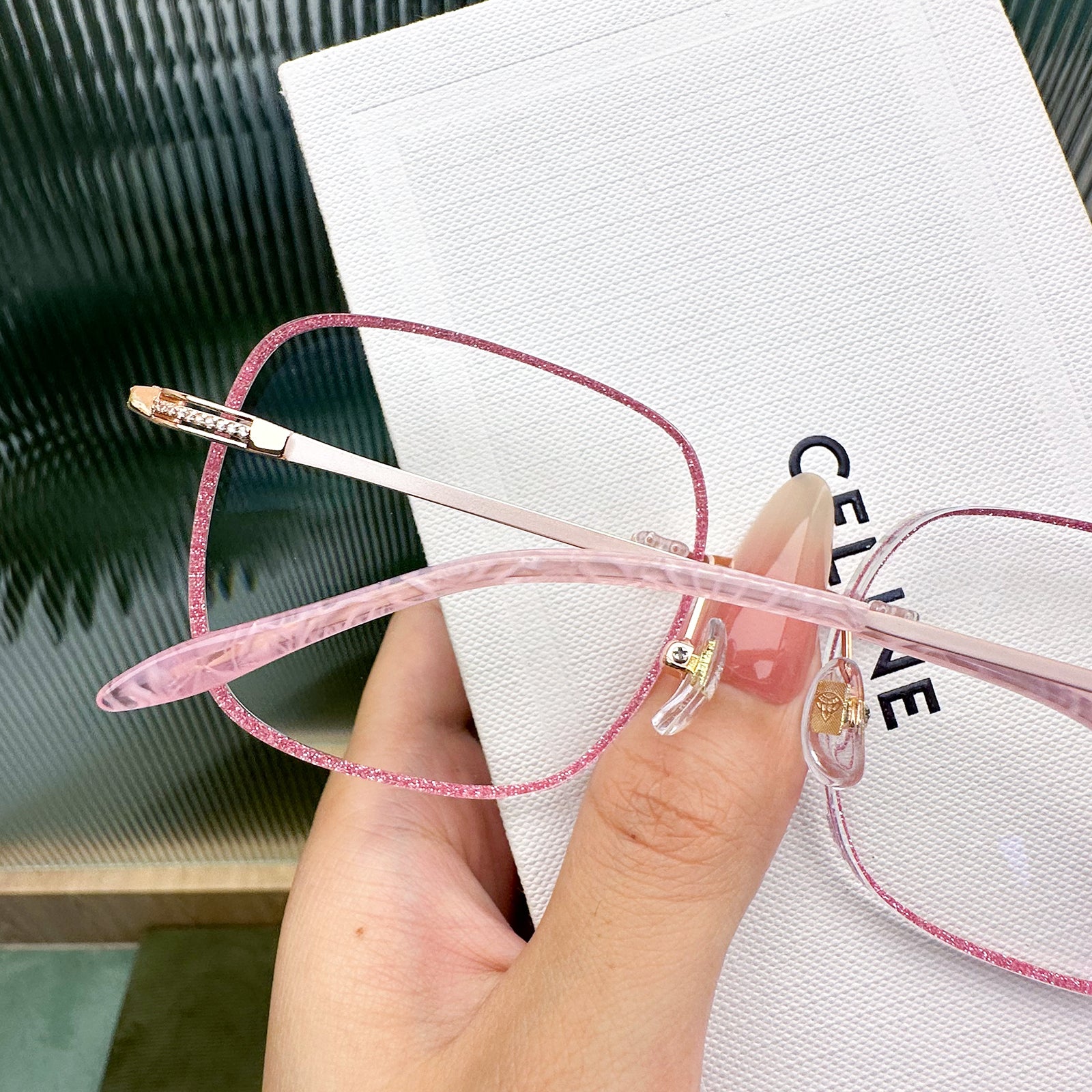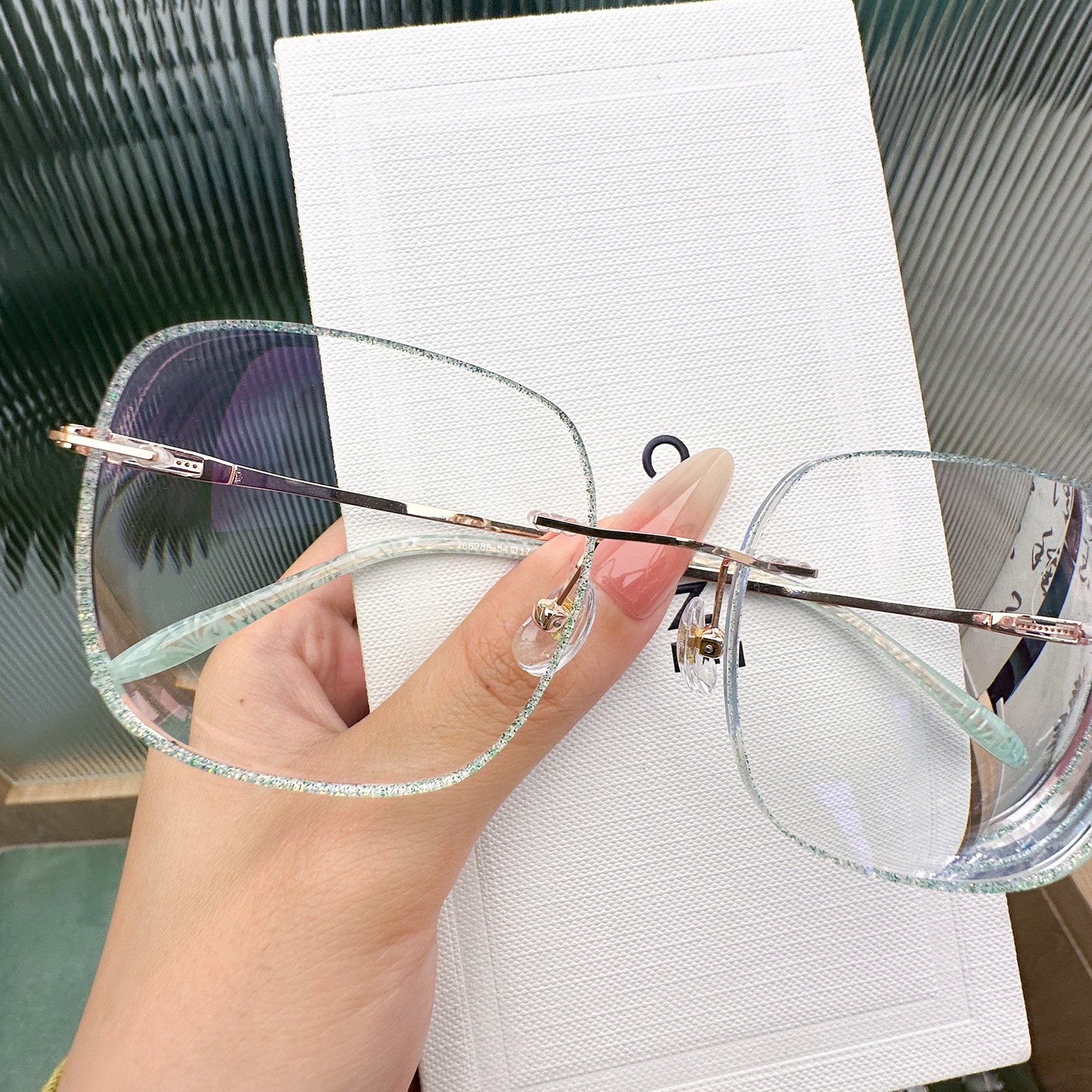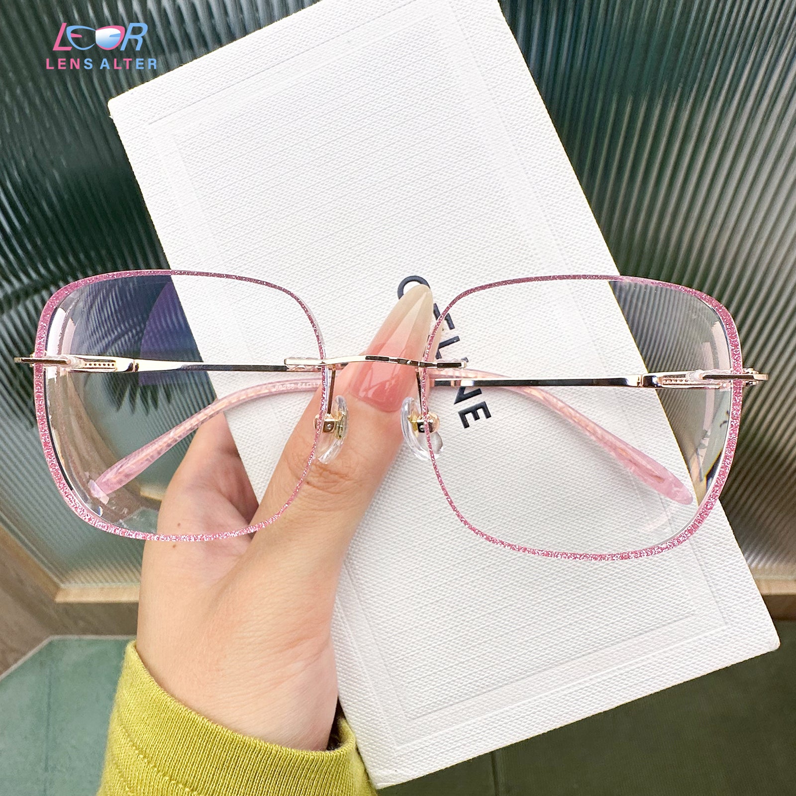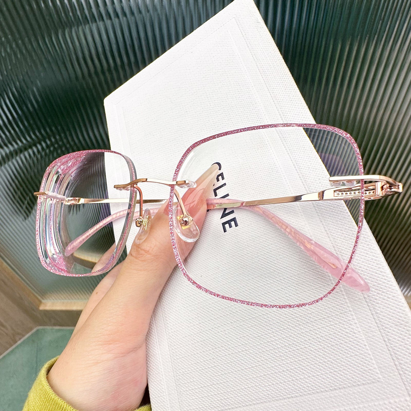 | Exlusive Design | Colorful Glitter Edge Square Rimless Glasses – This standout design features square lenses lined with vibrant, multicolored glitter along the edges, catching the light beautifully with every movement. The sleek metal temples add a modern, polished touch, balancing playful charm with elegant minimalism. A perfect statement piece for fashion-forward individuals who love a pop of sparkle.