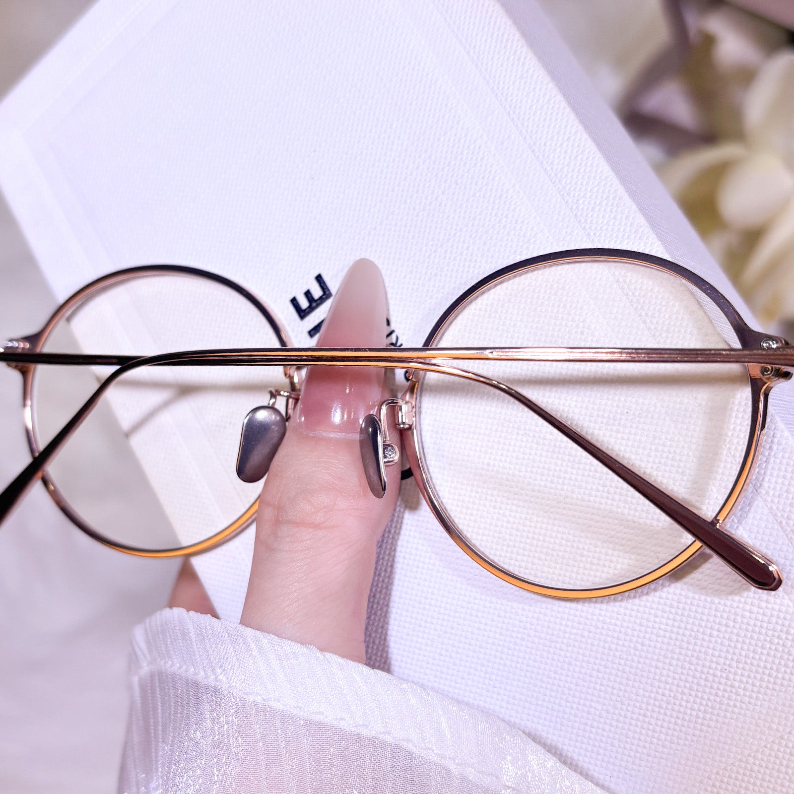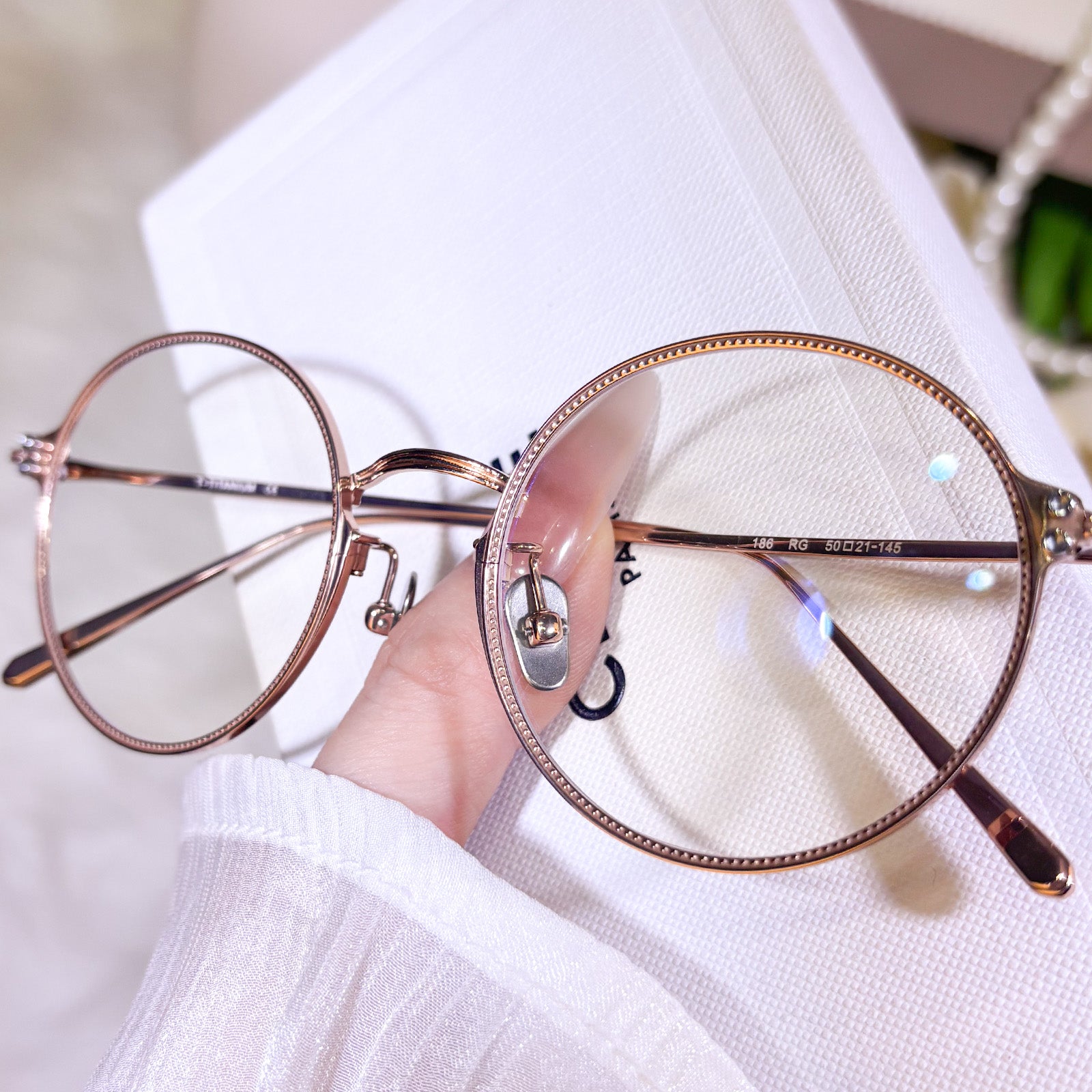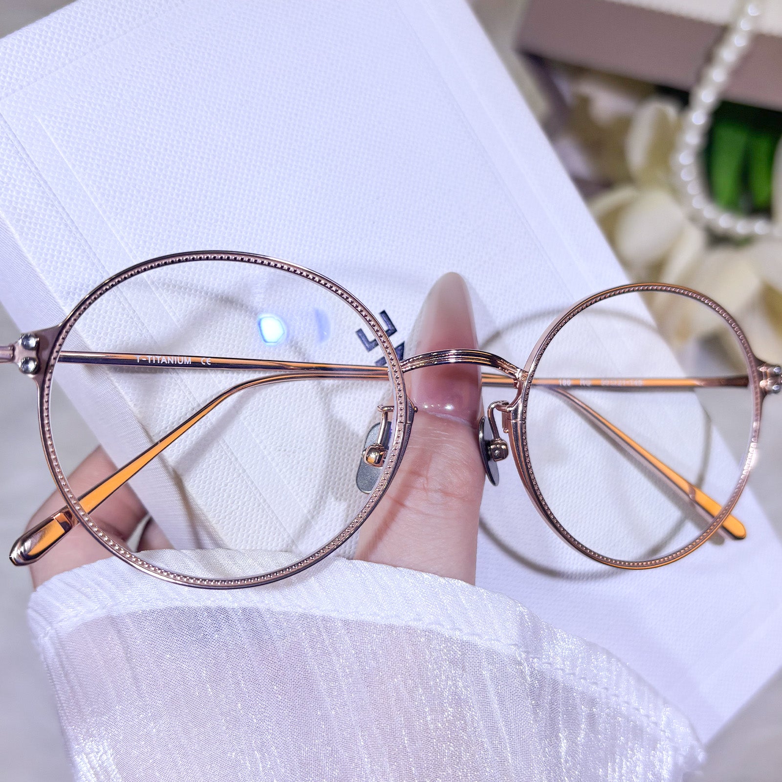 Exquisite titanium glasses for women in rose gold color, made of superior quality material. Lightweight, durable and comfortable, with a delicate and elegant glossy finish. Stylish and textured, perfect for daily and commuting wear.