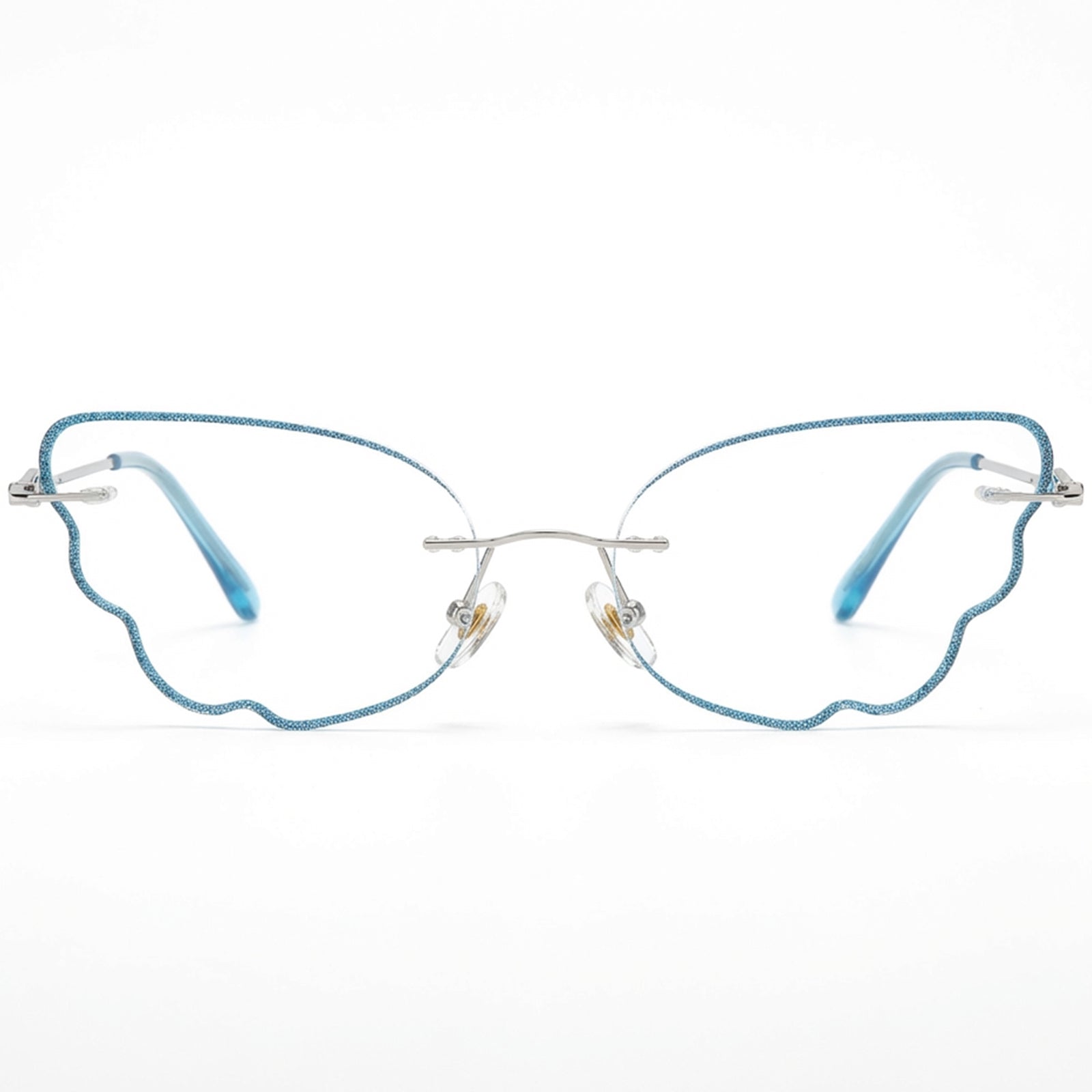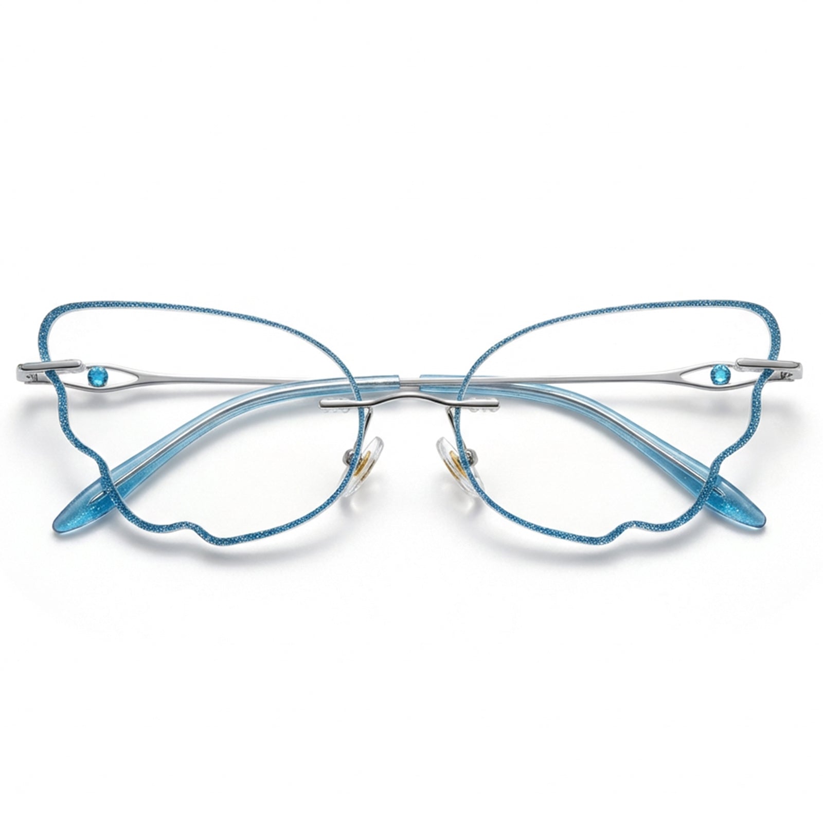 | Exclusive Design | These angel-wing–shaped rimless glasses bring a heavenly touch to your style, featuring soft blue tones and shimmering glitter along the edges of the lenses. The gemstone-adorned temples add an extra sparkle, making the whole piece feel divine, dreamy, and beautifully ethereal. Perfect for anyone who loves graceful, magical accessories.